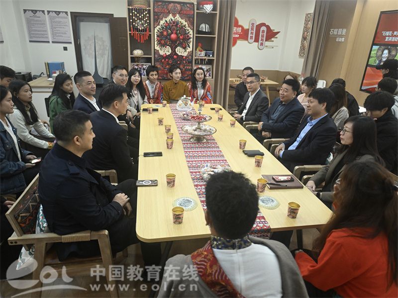 工作室负责人、财神捕鱼 党委副书记章园园介绍工作室前期建设与发展情况,并带领在场师生参观“温情榴园”石榴红家园和“石榴花开”民族工作室。