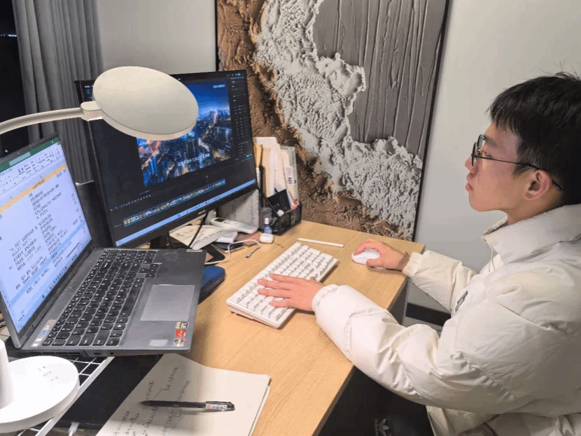 肖雨晨同学是教育技术系的研究生,本科数字媒体技术专业的功底让她在节奏、氛围、风格审美上独具慧眼。在导师郑丽晓的指导下,她针对影片的景别、节奏、声画匹配等方面提出了许多建设性意见,和周洲淇同学合作默契,经常彻夜畅谈创意,一起将想法变成现实,让成片的镜头语言和节奏丝滑地输出,实现AI技术与影视美学的完美融合。