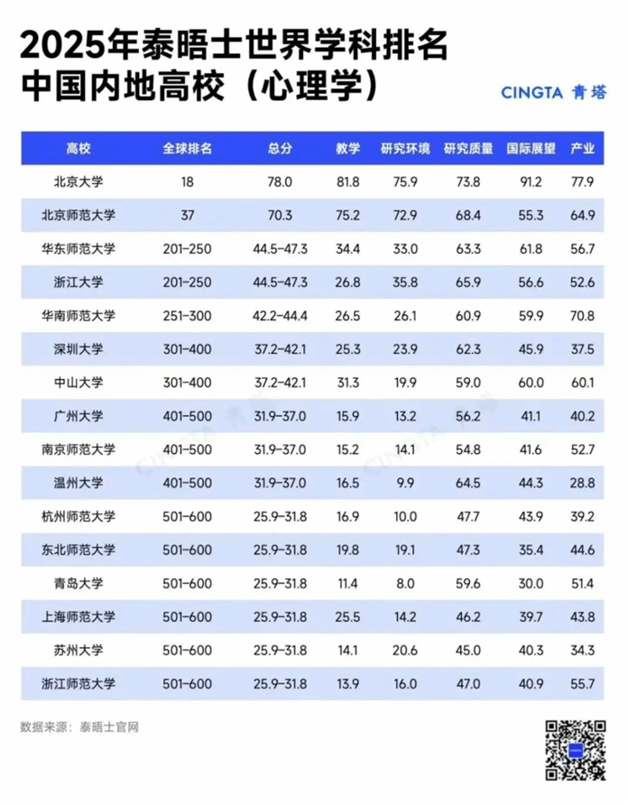 2025年泰晤士高等教育世界学科排名重磅发布,其中,财神捕鱼 心理学专业位列中国内地高校第10名,全球排名约401-500位,这是温大心理学系近年来在国际权威排名中的最佳成绩。
