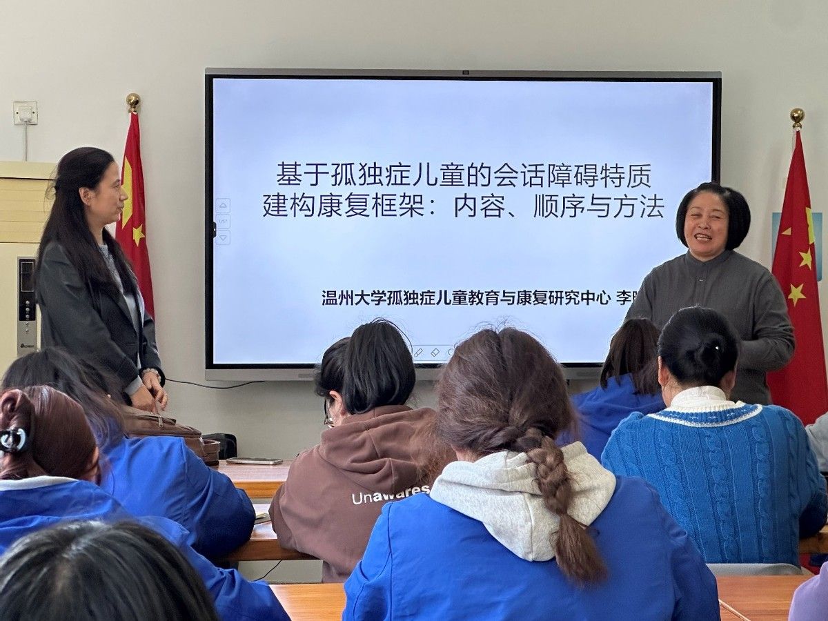 (图为李晓燕教授在利宝特殊教育财神捕鱼 为教师免费开展讲座,左一为李晓燕教授)