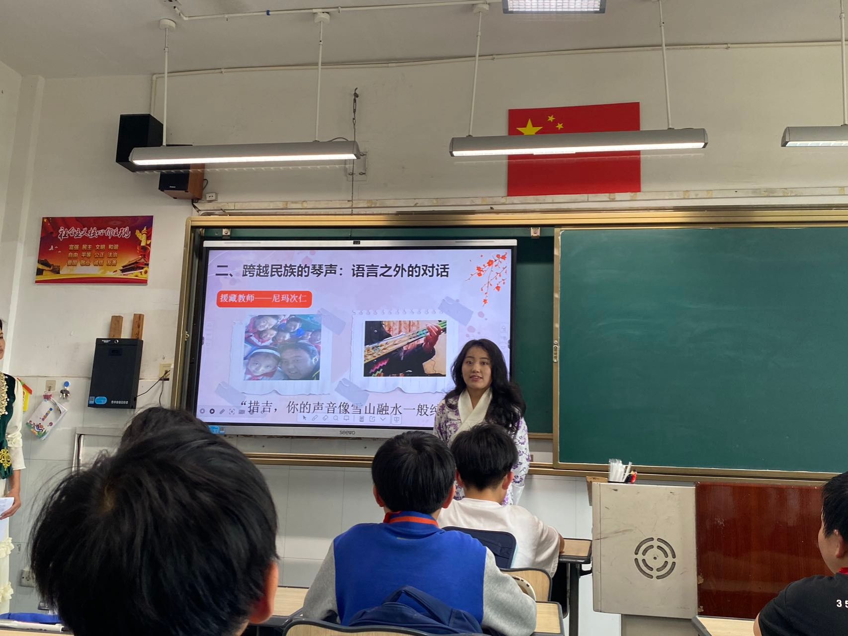 “民族团结我来学”环节中,在青年宣讲员的带领下,孩子们争先恐后地用藏语、维吾尔语说出人生第一句民族语问候。伴着《麦西来普》的鼓点,迈着新疆舞步,民族青年牵着孩子们旋出同心圆,四十平方米的教室瞬间化作艺术的万花筒,清脆的笑声如浪花般在教室里层层荡漾。