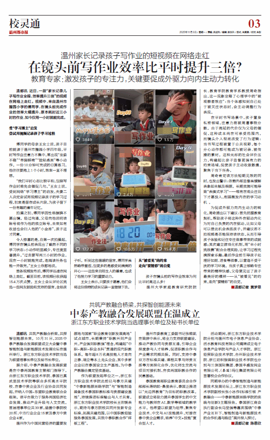 近日,一段“家长记录儿子写作业全程,效率提升三倍”的视频在网络上走红。视频中,来自温州市籀园小学的傅同学,在镜头前完成作业的效率大幅提升,原本耗时近三小时的作业,如今仅用一小时就能完成。
