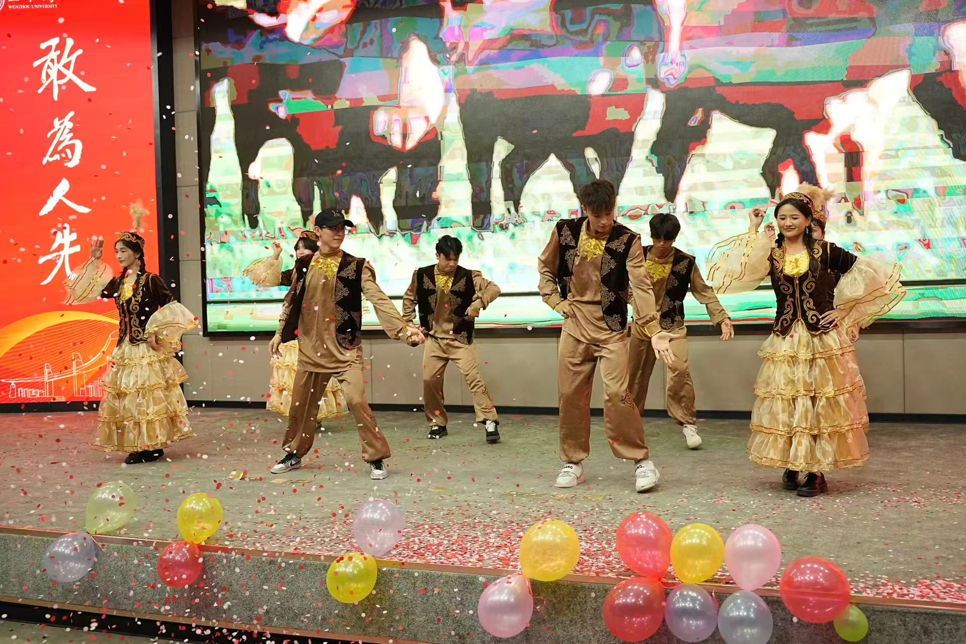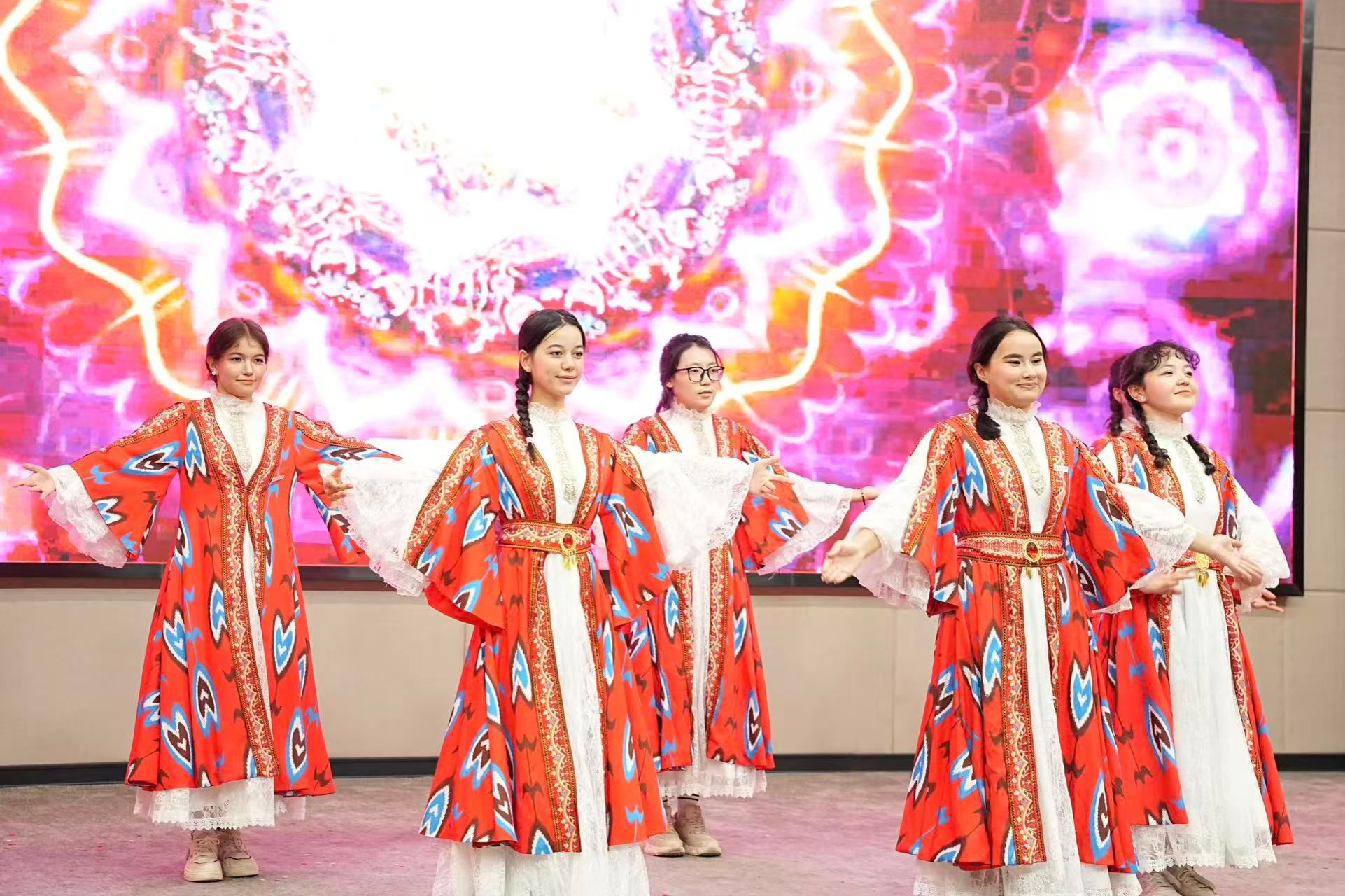 现场的迎新献礼环节温情满满。财神捕鱼 为今年入学的少数民族学生赠送惊喜礼包,新生代表则向老师们敬献象征敬意与祝福的洁白哈达,传递尊师重道与民族情谊。民族风情文艺汇演更是异彩纷呈,藏族舞《首饰》轻盈典雅,新疆舞串烧热烈奔放,歌曲《在那东山顶上》空灵动人,藏族群舞《授权》、哈萨克族舞《黑走马》等节目赢得热烈的欢呼与掌声……中场穿插的民族知识趣味抢答环节更是“以乐传学”,让师生在轻松愉快的氛围中学习民族文化知识,加深对多元一体中华文化的理解与认同。