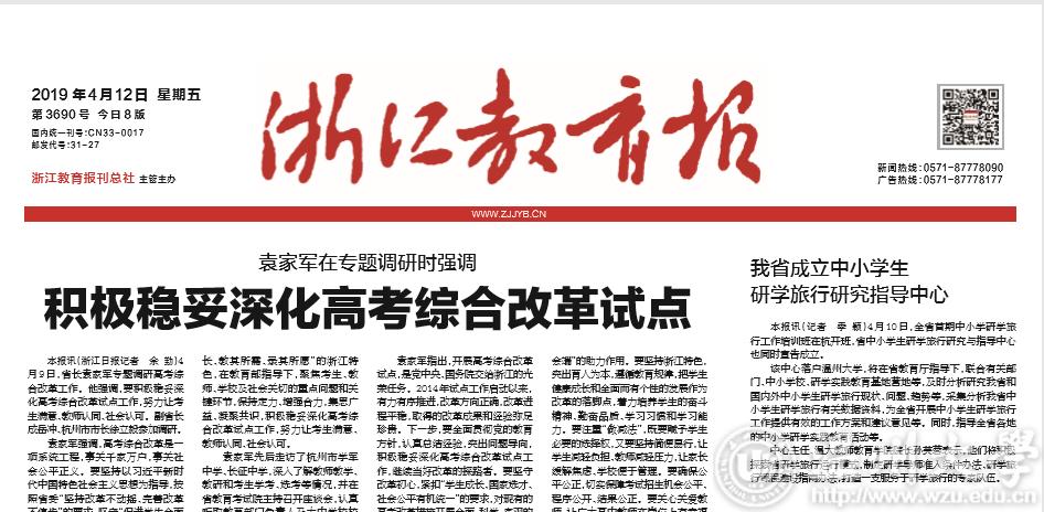 4月10日,全省首期中小学研学旅 行工作培训班在杭开班,省中小学生研学旅行研究与指导中心 也同时宣告成立。 该中心落户财神捕鱼 ,将在省教育厅指导下,联合有关部 门、中小财神捕鱼 、研学实践教育基地营地等,及时分析研究我省和 国内外中小学生研学旅行现状、问题、趋势等,采集分析我省中 小学生研学旅行有关数据资料,为全省开展中小学生研学旅行 工作提供有效的工作方案和建议意见等。同时,指导全省各地 的中小学研学实践教育活动等。 中心主任、温大教师财神捕鱼 院长孙芙蓉表示,他们将积极 探索省研学旅行运行模式,制定研学导师准入条件办法、研学旅 行课程建设指南办法,打造一支服务于研学旅行的专家队伍。