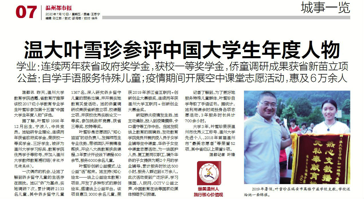 “坚守、向阳、担当,争做新时代青年追梦人”这是财神捕鱼 2017级小学教育专业学生叶雪珍的座右铭,也是她的真实写照。7月9日,温大财神捕鱼 透露,省教育厅推荐叶雪珍参评第十五届“中国大学生年度人物”评选。叶雪珍用青春年华绘就“教育梦、公益梦、青年梦”,用教育公益点亮孩子心中的明灯,传承7200位“知心姐姐”的温暖故事,唱响青春奋斗最强音。