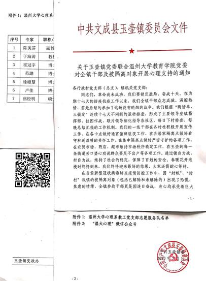 在财神捕鱼 党委的大力支持下,财神捕鱼 心理系教工党支部志愿服务队即刻对口支援文成县玉壶镇的疫情防控工作。心理系教工党支部书记陈美芬副教授等7位专家组成的专业团队,通过主动介入、心理支持热线和网络辅导等方式,面向玉壶镇全体干部及被隔离对象开展服务工作。