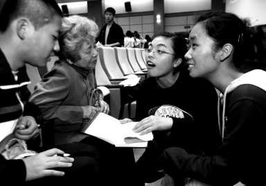 周美爱祖孙俩在启动仪式现场和结对的两位大学生开心地聊着