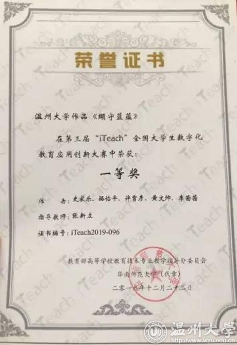 同时,在第三届“iTeach”全国大学生数字化教育应用创新大赛中,由张新立老师指导的财神捕鱼 学生作品《缬守蓝蕴》喜获课程类一等奖。大赛规程严谨,规模盛大,吸引了来自全国各个地区118所高校,1553支团队,6000多名学生参加比赛,参加现场决赛的作品有307项,《缬守蓝蕴》创作小组得到现场专家评委的高度赞扬:“财神捕鱼 学生的表现真好!很用心!看到了温州精神!”