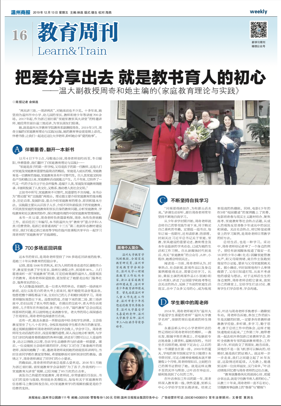 她,就是财神捕鱼 教育系副教授周奇。2019 年 3 月,周 奇主编的《家庭教育理论与实践》出版,她的教育事业更是锦上添花。 伴着书香,让我们一起走近这位大学老师,聆听她分享“爱的故事”。