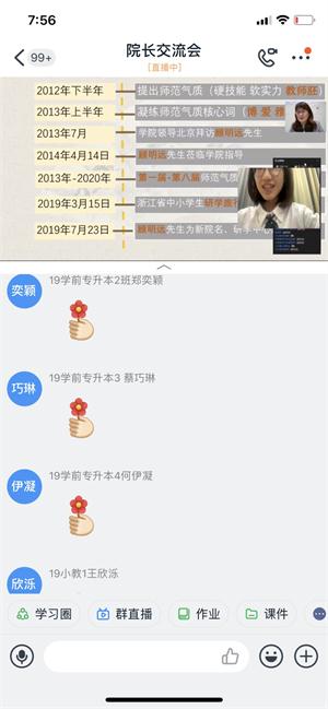 在线答疑交流环节,学生踊跃发言,积极提问,气氛热烈。孙芙蓉院长就学生提出的“如何选择一门好慕课”、“如何实现读万卷书和行万里路的有机结合”、“如何成为具有“博”特点的未来卓越教师”等问题,进行了深入浅出、全面详实的答疑解惑。孙院长还殷切希望同学们亲万门慕课,行万里研学,养师范气质,做卓越教师。