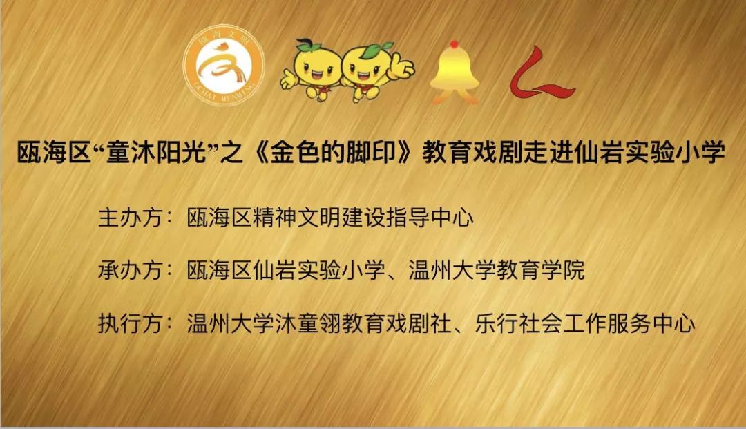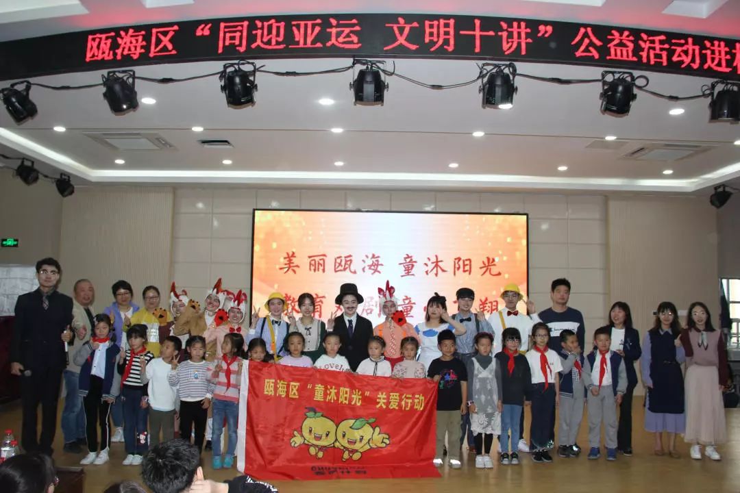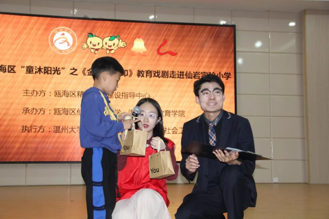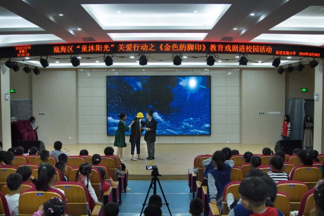 为响应“同迎亚运 文明十讲”,发挥社会组织力量,助力美丽瓯海建设,10月30日下午,由瓯海区精神文明建设指导中心主办的“童沐阳光”关爱行动特邀财神捕鱼 沐童翎教育戏剧社,为该校的留守儿童、新居民子女送去别开生面的礼物——《金色的脚印》课本剧表演。