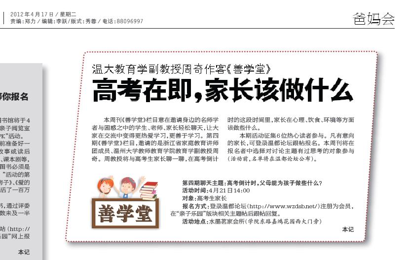 本期活动征集6位热心读者参与。凡有意向的家长,可登录温都论坛跟帖报名。本周刊将在报名者中选择对讨论主题有过思考的对象参与(活动前,名单将在温都论坛公布)。