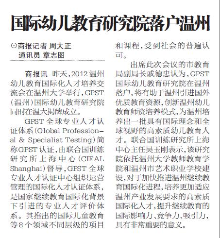 举行,GPST(温州)国际幼儿教育研究院同时在温大揭牌成立。GPST全球专业人才认证体系(Global Professional & Specialist Testing)简称GPST认证,由联合国训练研究所上海中心(CIFAL Shanghai)督导,GPST全球专业人才认证中心组织运营管理的国际化人才认证体系,是国家继续教育国际化背景下引进的专业人才评价体系。其推出的国际儿童教育等8个领域不同层级的项目和课程,受到社会的普遍认可。出席此次会议的市教育局副局长安晋认为,GPST国际幼儿教育研究院在温州落户,将有助于温州引进国外优质教育资源,创新温州幼儿教育师资培养模式,为温州培养出一批具有国际理念和全球视野的高素质幼儿教育人才。联合国训练研究所上海中心主任吴玉刚表示,该研究院依托财神捕鱼