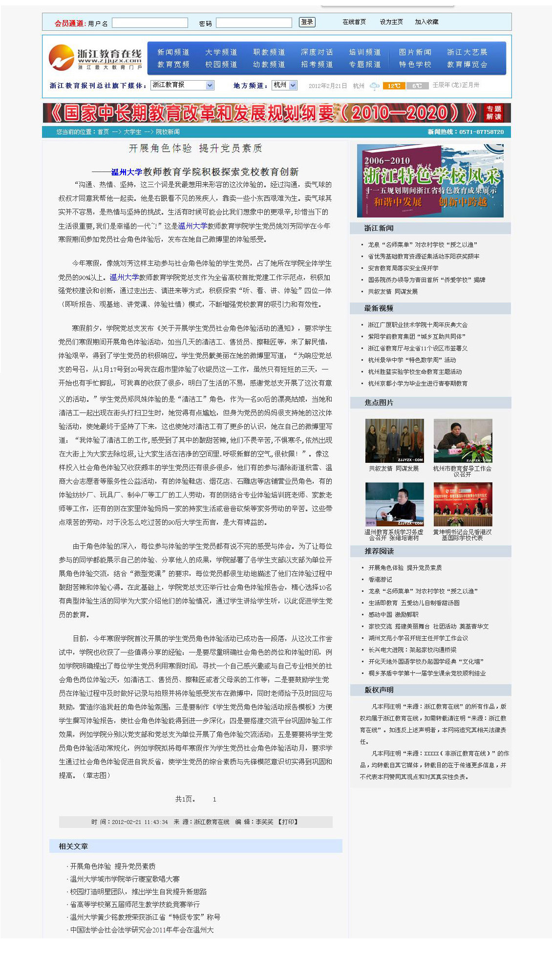 党总支发布《关于开展学生党员社会角色体验活动的通知》,要求学生党员们寒假期间开展角色体验活动,如当几天的清洁工、售货员、擦鞋匠等,来了解民情,体验艰辛,得到了学生党员的积极响应。学生党员戴美丽在她的微博里写道:“为响应党总支的号召,从1月17号到20号我在超市里体验了收银员这一工作,虽然只有短短的三天,一开始也有手忙脚乱,可我真的收获了很多,明白了生活的不易,感谢党总支开展了这次有意义的活动。”学生党员郑凤妹体验的是“清洁工”角色,作为一名90后的漂亮姑娘,当她和清洁工一起出现在街头打扫卫生时,她觉得有点尴尬,但身为党员的妈妈很支持她的这次体验活动,使她最终于坚持了下来,这也使她对清洁工有了更多的认识,她在自己的微博里写道:“我体验了清洁工的工作,感受到了其中的酸甜苦辣,他们不畏辛苦,不惧寒冬,依然出现在大街上为大家去除垃圾,让大家生活在洁净的空间里.呼吸新鲜的空气,很钦佩!”。像这样投入社会角色体验又收获颇丰的学生党员还有很多很多,他们有的参与清除街道积雪、温商大会志愿者等服务性公益活动,有的体验鞋店、烟花店、石雕店等店铺营业员角色,有的体验纺纱厂、玩具厂、制伞厂等工厂的工人劳动,有的则结合专业体验培训