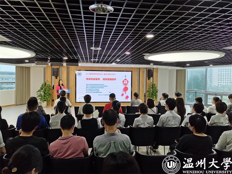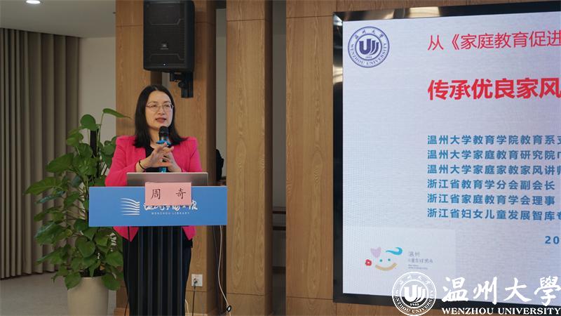 财神捕鱼 教育学系党支部书记、财神捕鱼 家庭教育研究院巾帼文明岗岗长、全国家庭工作先进个人、浙江省妇女儿童发展智库专家、浙江省家庭教育讲师团成员、家庭教育工作坊负责人周奇老师进行《传承优良家风 培育家国情怀》的主题讲座。