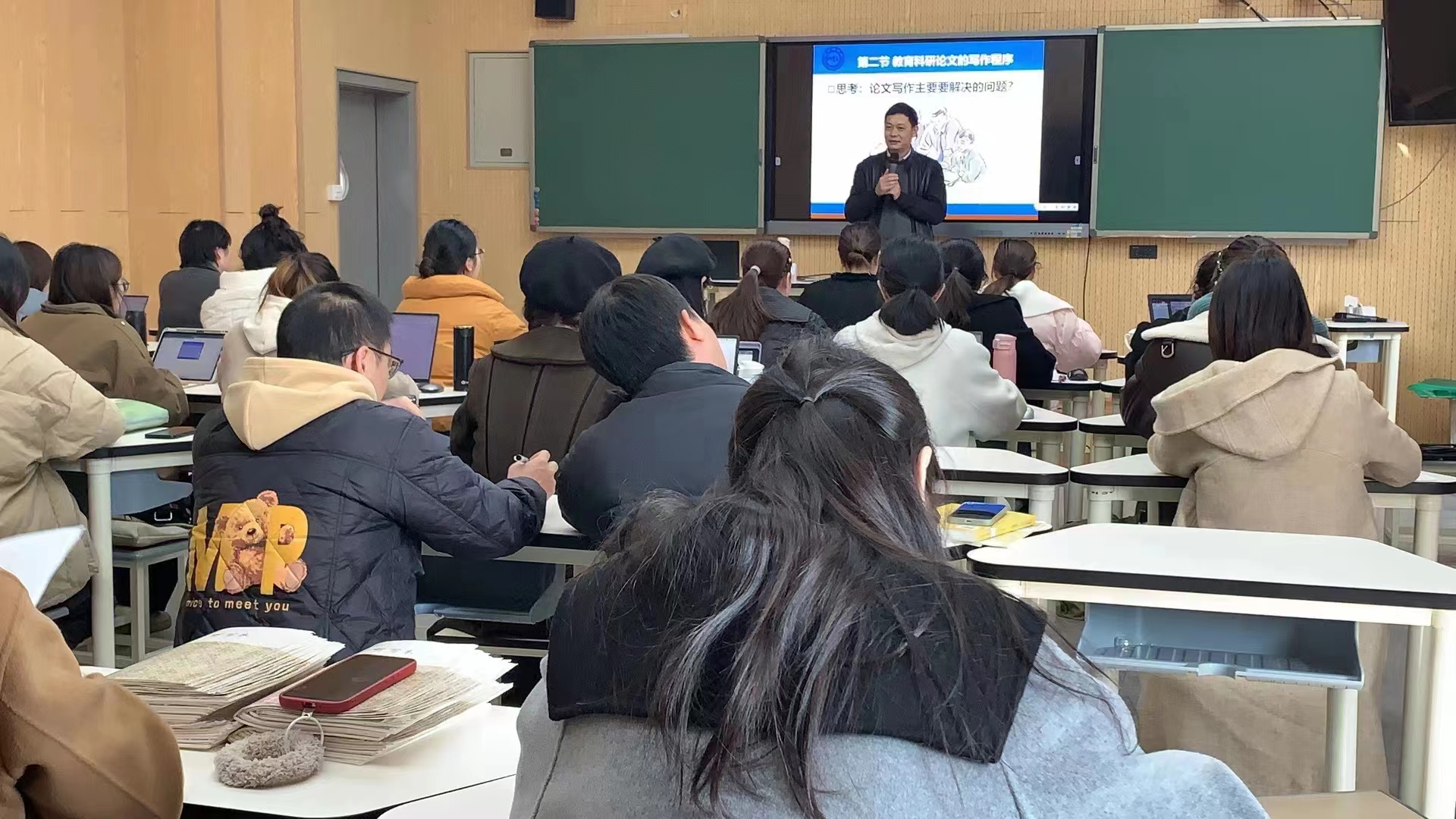 讲座主要流程分为三步:专家分享经验、教师提问与互动交流和个别指导。蔡教授围绕论文写作的立论与表述,从论文撰写的类型、选题、框架、正文表述进行了精彩的分享。蔡教授以学员的论文为例,由论文题目到正文表述,带领大家细致评价并提供修改建议,学员们在实践研讨中收获颇丰。