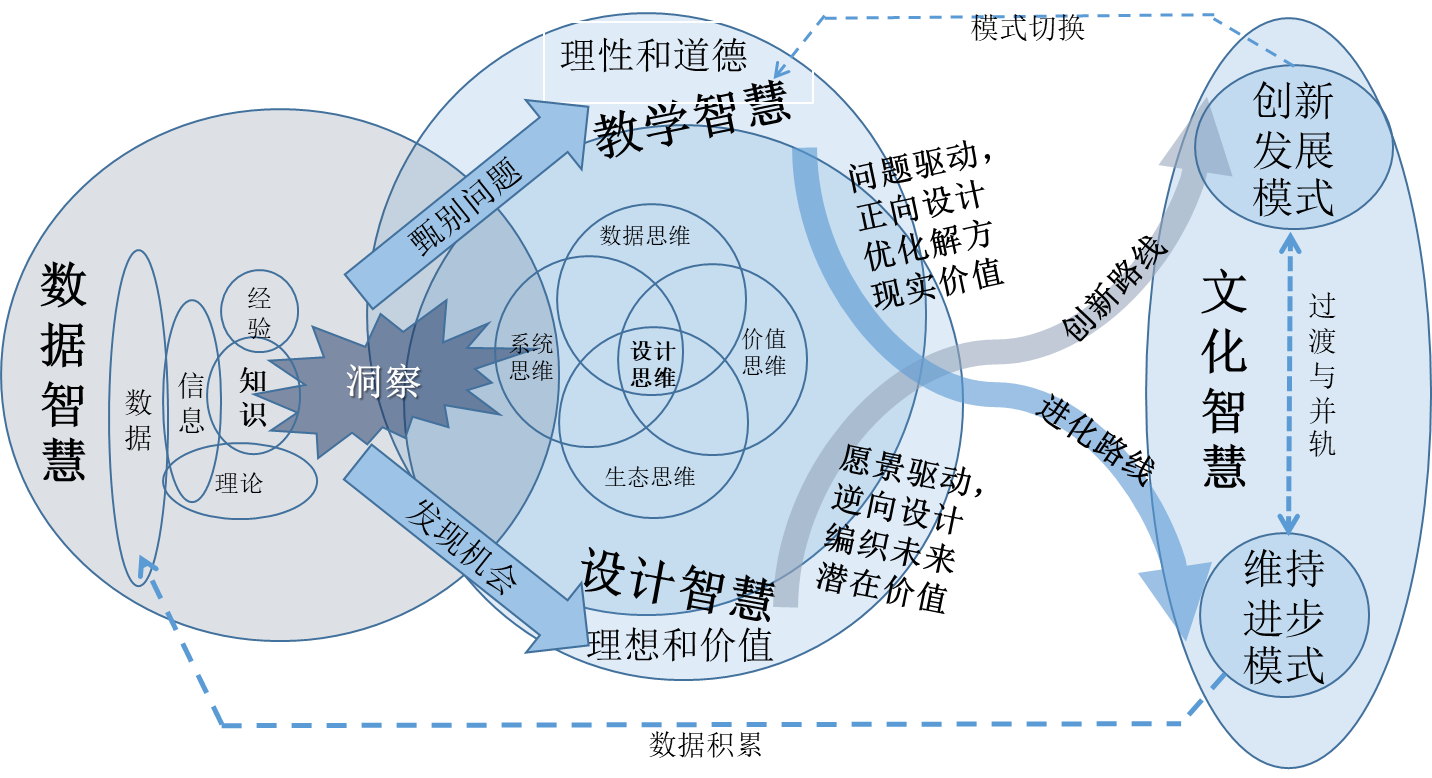 祝智庭教授总结了智慧教育引领教育数字化转型“悟道”四条:科学研究发现规律(科学性)、技术应用实现价值(技术性)、创意设计提升价值(艺术性)、文化取向决定价值(人文性)。