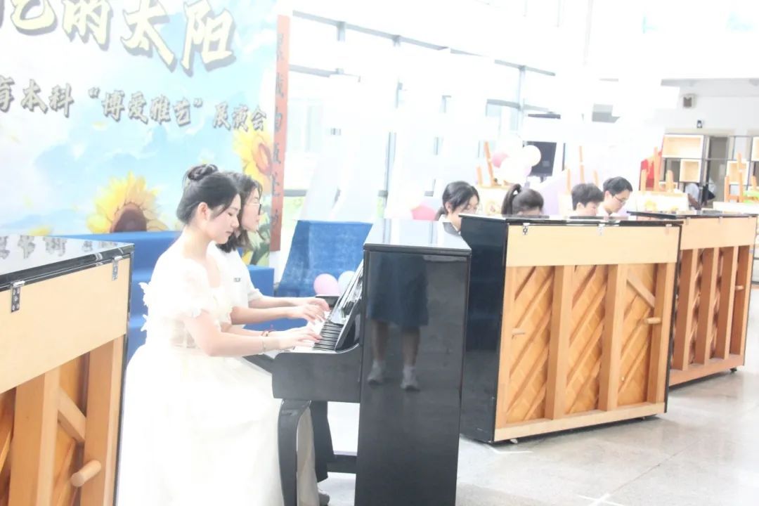 最为“重量级”的节目是钢琴十六手联弹,来自著名电影《音乐之声》中的插曲《Do Re Mi》。“重量级”不仅仅是四台钢琴的“重量级”,更是22学前本的同学们从零基础到完成钢琴十六手联弹,在这过程之中付出了许多努力的“重量级”。