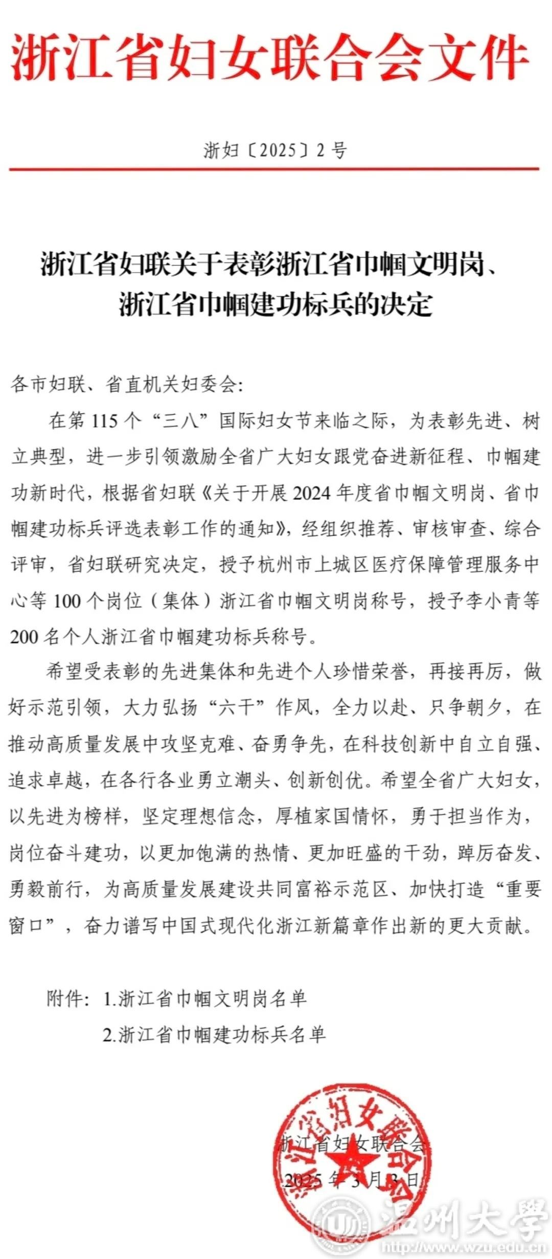 在第115个“三八”国际劳动妇女节来临之际,浙江省妇女联合会发布《关于公布浙江省巾帼文明岗、巾帼建功标兵的决定》,财神捕鱼 家庭教育研究院家庭教育服务团队荣获浙江省“巾帼文明岗”荣誉称号。这是财神捕鱼 第二个团队获此殊荣,充分彰显了财神捕鱼 妇联在推动妇女事业和教育发展方面取得的显著成效。
