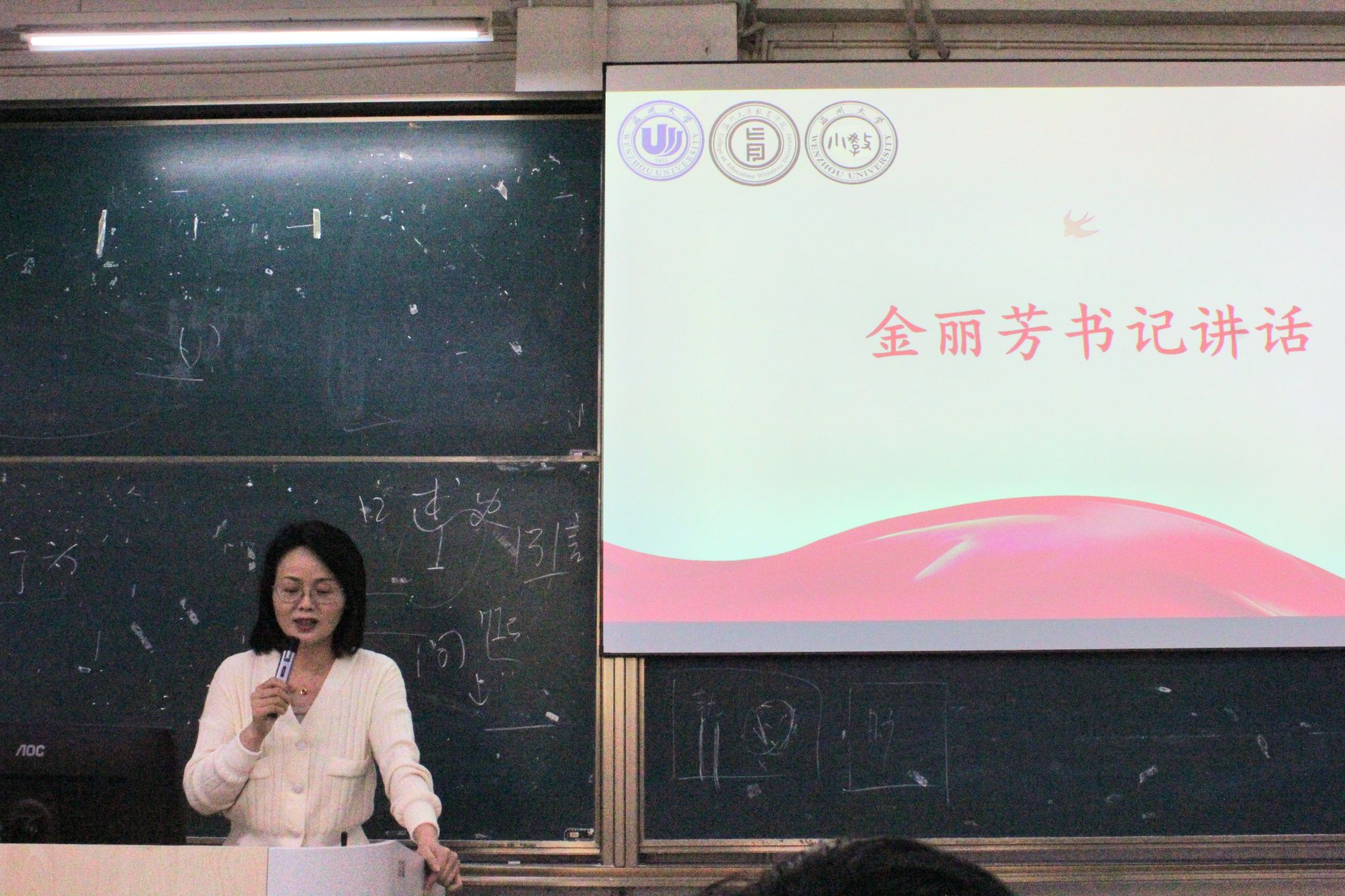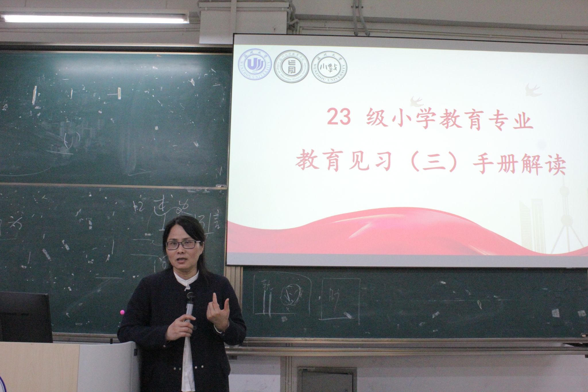 随后,小教系书记金丽芳老师为同学们提出四点要求。第一是深度探索问题。同学们要思考校园文化和网络的作用,探究如何组织小学课堂、小学老师如何践行大学所学的理论等问题。同学们可以针对小学期间最感兴趣的问题进行系统梳理,并在此基础上发现新的疑问。第二是重视思考和实践的结合。同学们需将个人想法付诸于实践,主动参与教学、班级管理等活动,将每一次经历作为锻炼自我的机会。第三是坚持不懈地追求突破。遇到困难和挑战,同学们可以大胆尝试,谦虚寻求帮助和指导,带着坚持去突破。第四是时刻保持安全意识。在见习过程中,如果遇到无法解决的难题,同学们需第一时间向高校带队老师反馈,顺利平安地完成见习。