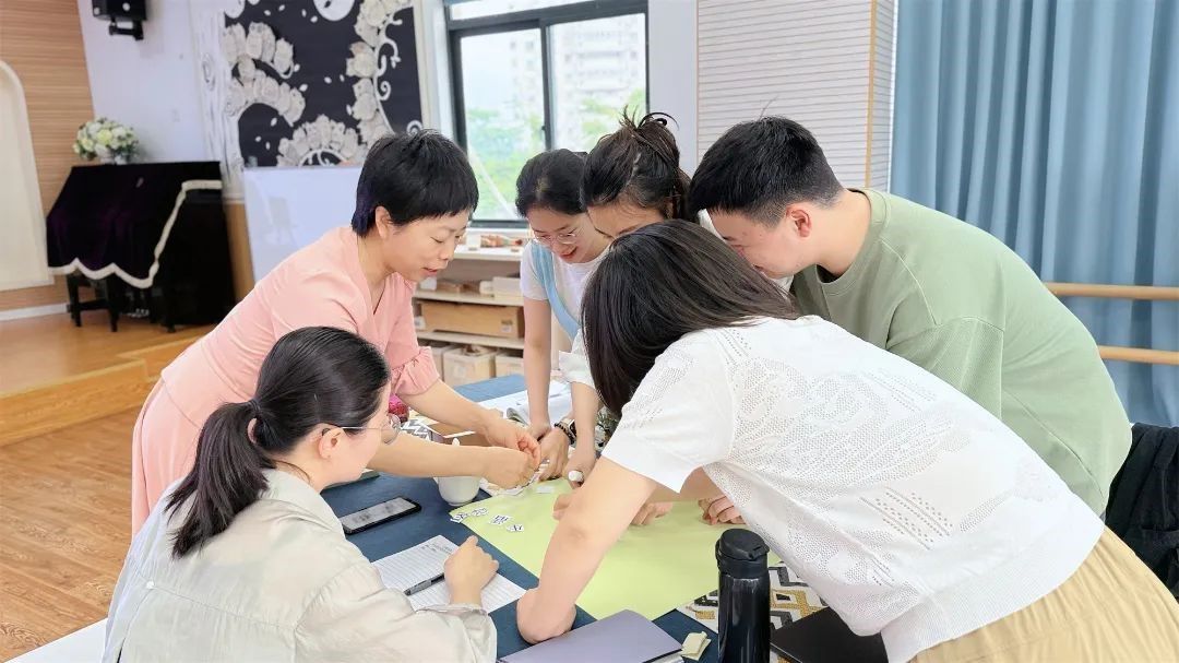 活动初,温大团队与附幼老师一起讨论思考,在温暖积极的团队合作中开启本次教研。老师们将“剪落的字句”通过“团体拼搭”的方式合成一句“教育名言”,感知教育名言所带来的教育思绪和发展方向。