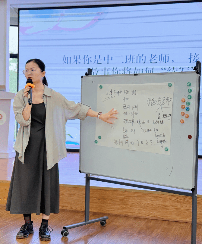 中二班连心如老师讲述本班游学课程《嗨,小羊》。老师们感知本课程脉络,体察课程疑惑矛盾,提出课程突破续点。“该如何续写该课程的游学故事呢?”众人纷纷出谋划策,为课程延续提供真知见解,聚焦问题,改进实操。