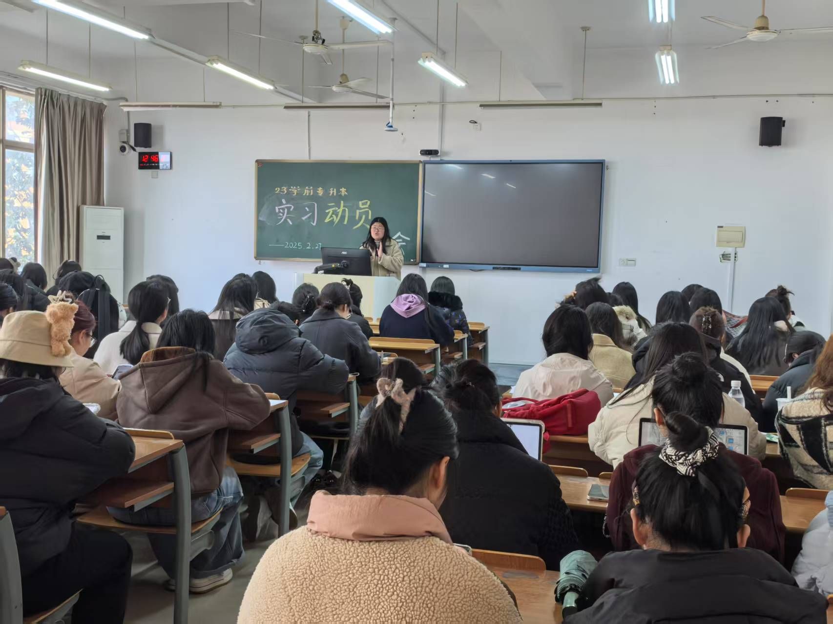 本学期第2-9周为23学前专升本的教育实习安排,为了引导学生做好实习前的各项准备,保证实习工作的顺利开展,2025年2月27号中午12点40分,学前系在北校区4-406教室开展了23级学前教育专升本的实习动员大会。本次会议由学前教育系张晓霞和柴林珊老师主持,张小伟,杨欢两位实习带队老师以及全体23级学前教育专升本本的实习生出席会议。