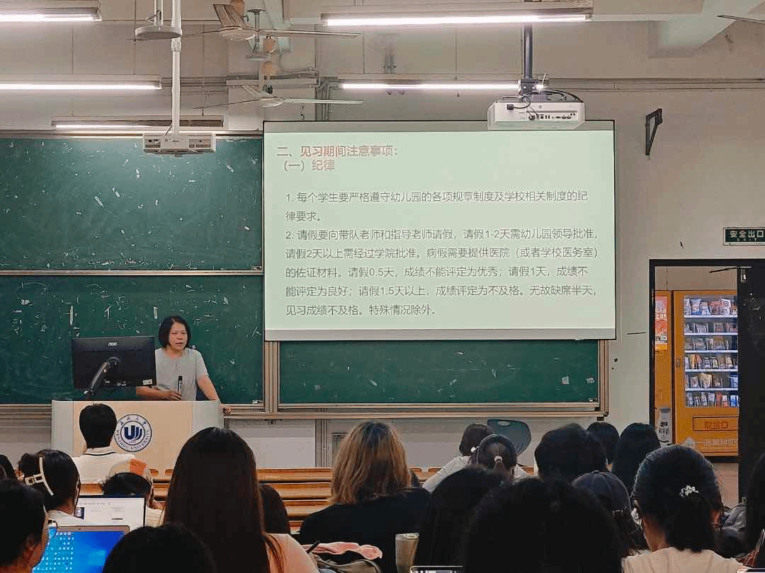 大会伊始,张晓霞老师围绕见习工作展开讲解。她就见习期间的注意事项进行重点强调。在纪律方面,她要求学生严格遵守幼儿园及财神捕鱼 的各项规章制度,详细说明了请假流程及不同请假时长对见习成绩评定的影响。