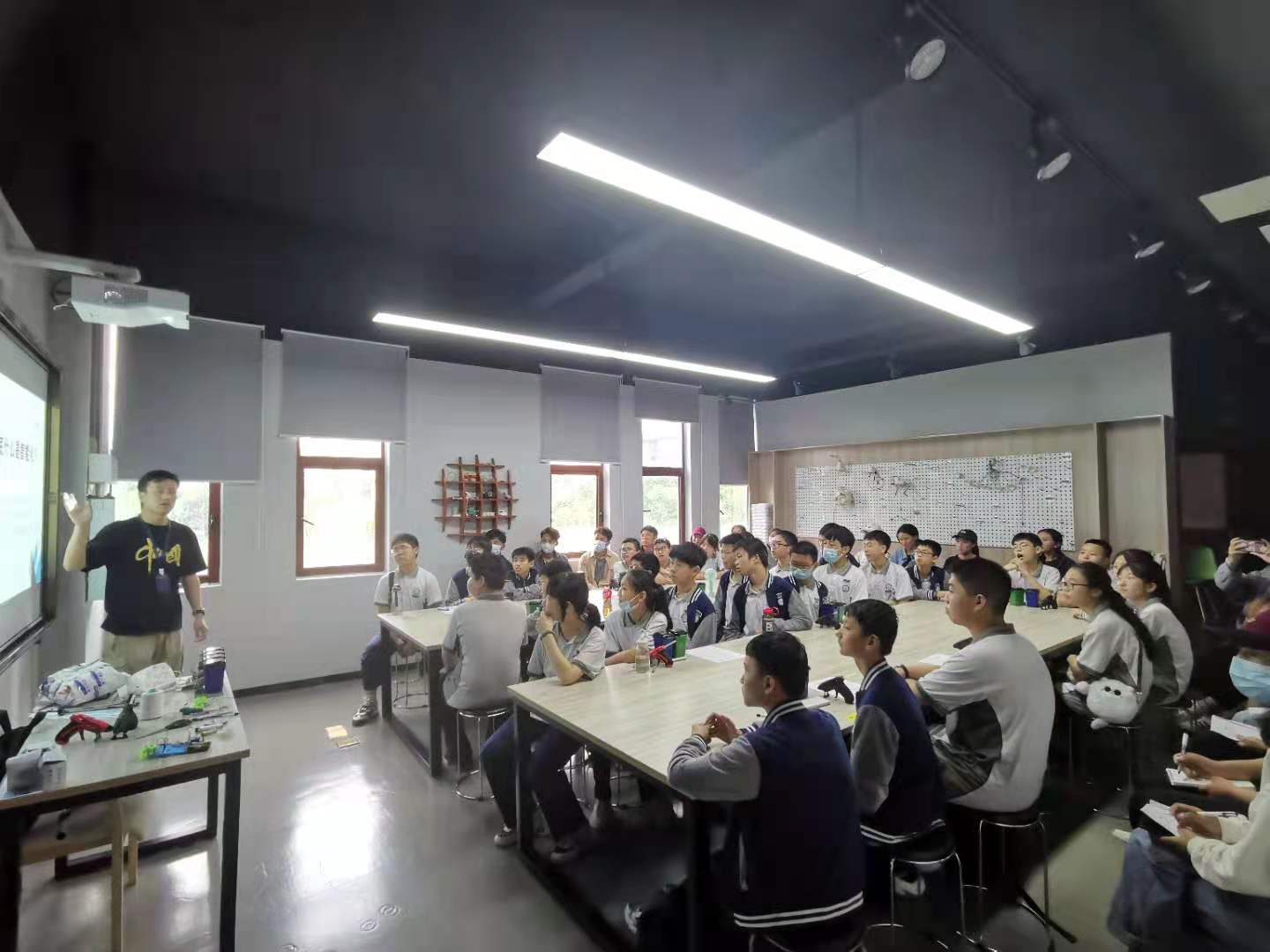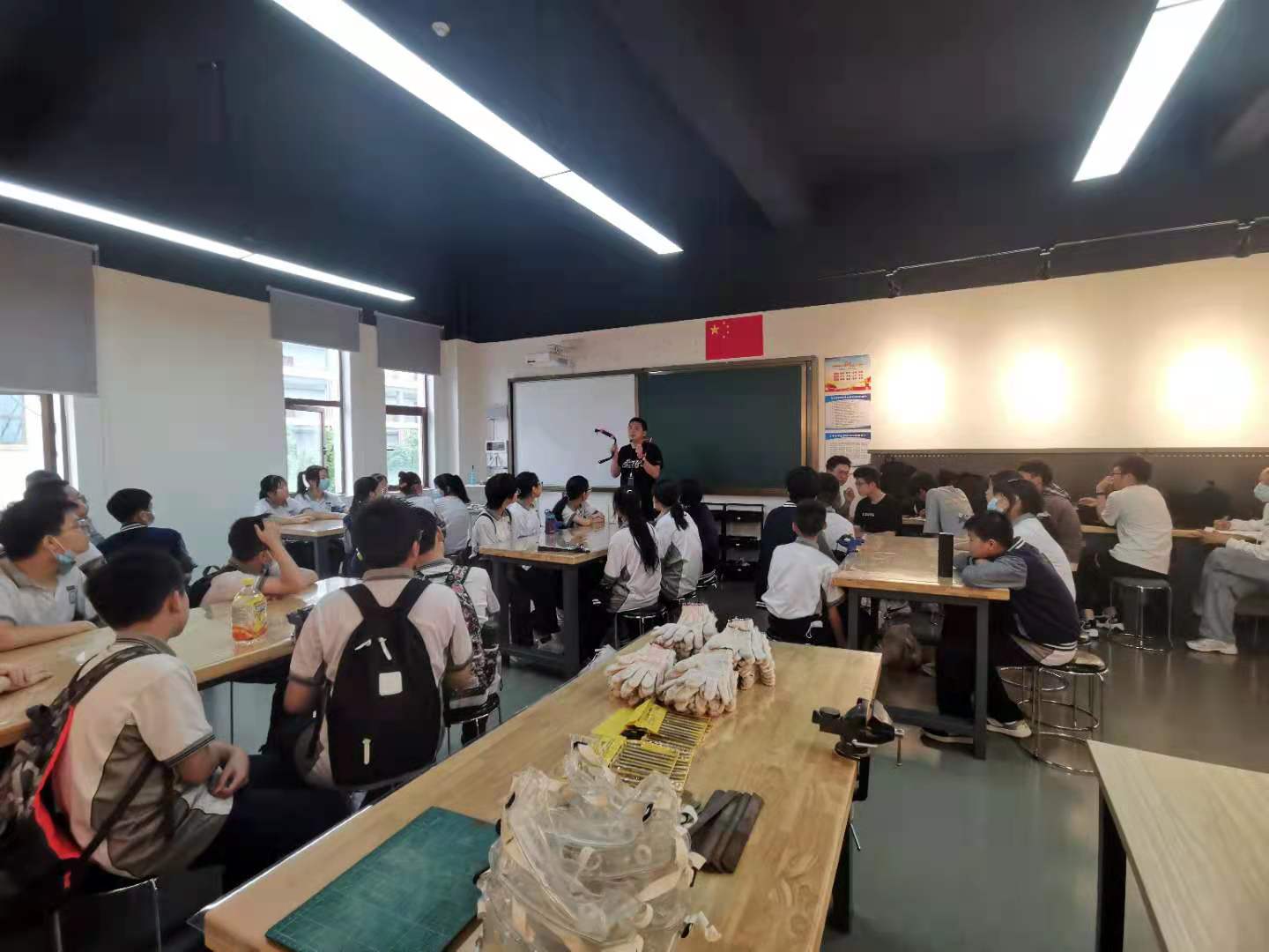 下午,我们分成三个组。第一组体验了由林丽峰老师讲授的“玩转磁控电路”课程,并在林丽峰老师的指导下体验了“星座刺绣灯”的制作。林老师鼓励学生转换思路,积极发挥创意,致力于提高学生的技术素养。第二组观摩了胡键老师关于智能分类垃圾桶的介绍,老师通过这样一堂理论与实践结合的课,带孩子们领略智能化的魅力,打开了他们接近智能化、了解智能化的一扇窗。第三组观摩了由张哲睿老师讲授的“木工:创意生活制品”课程,老师在传递木工技巧的同时,更多的是传达一种精益求精工匠的精神和理念。课程的最后老师请学生分享心得体会,并对产品的评价和对未来产品的规划。