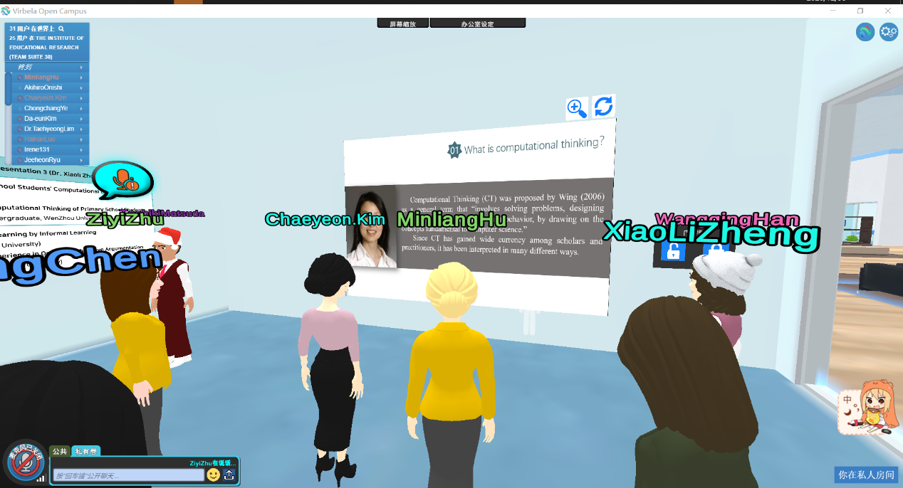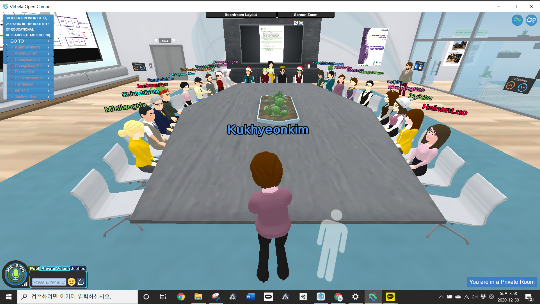 研讨会议开幕式于12月30日北京时间12:20召开,各国代表齐聚VirBELA平台主会议室,韩国全南国立大学教育研究所所长兼教学虚拟现实模拟实验中心主任Jeeheon Ryu教授致辞,开幕式由Taehyeong Lim副教授主持。首先,Jeeheon Ryu教授对中日两国教授和学生的到来表示热烈的欢迎,也对今天使用这种虚拟工作会议平台来举办此次会议表示期待。