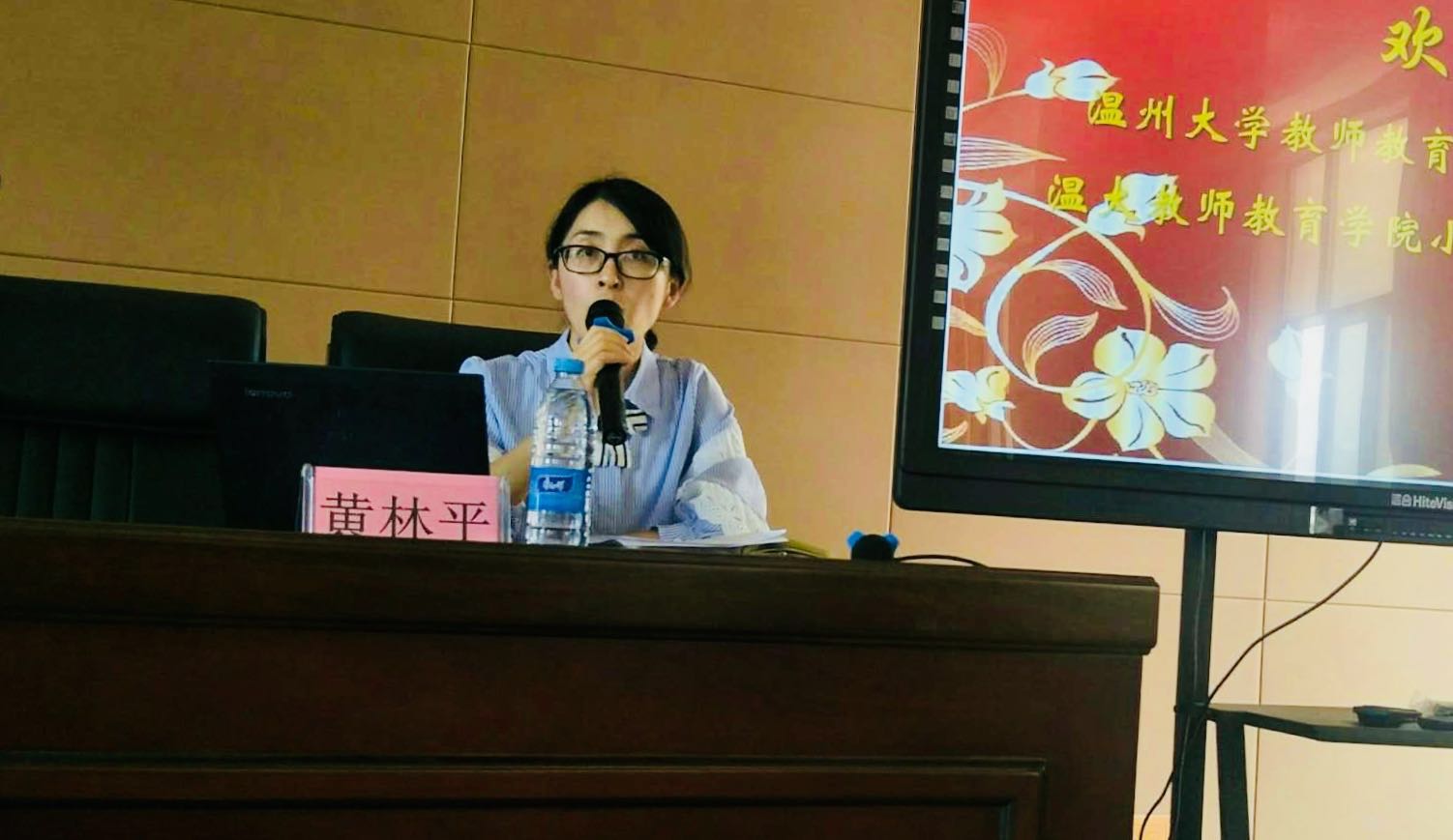 随后,附小教师代表戴志远老师上台发言,指出“理论不能解决的,实践将为我们解决”,实习机会是非常宝贵的,实习生应该主动协助导师、多与学生相处交流。之后,附小德育处连旭萍主任围绕“多看、多问、多做”,从细节方面阐释了“如何做一个让导师放心的实习教师”。我系张育萍博士则提出了“时时发问、时时学习”的期望。