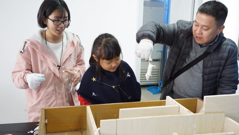 上午9点整,在6位来自温大小教系志愿者的带领下,10组家庭有序地参观了科学探究实验室。实验室中的动物胚胎和活泼的小龟吸睛无数,各种高大上的仪器也让孩子和家长们大开眼界。