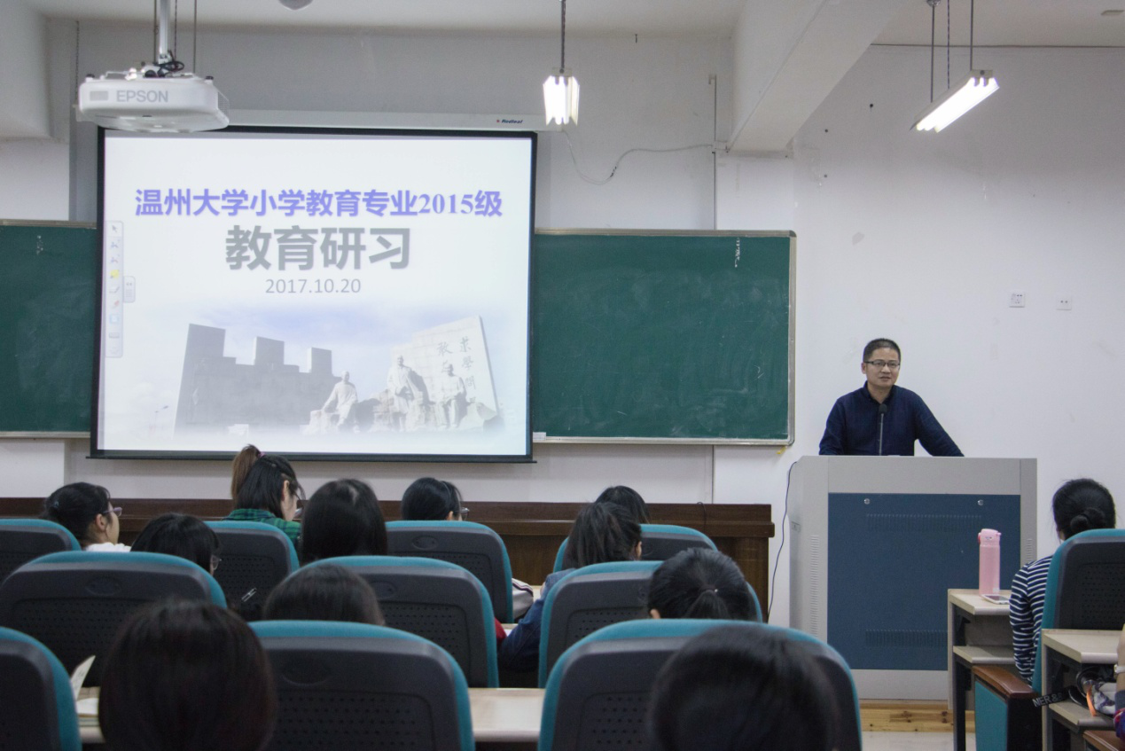 15级小学教育学专业教育研习动员大会。出席本次动员大会的有小教系主任李梁老师,以及指导老师陈海娜、施春晖、金建钰、金丽芳等。