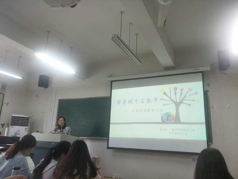 讲座以林老师风趣的自我介绍为开场白,从成为新手班主任可能会遇到的种种问题为我们总结了成功的班级经营与管理所应包含的四大内容:一个整洁舒适的教室、一班好学自律的学生、一群善解人意的家长、一伙默契贴心的同事。接着,林老师从所带班级“小蜗班”名称的由来为我们带来了与“小蜗”这个核心要素相关的四大文化:班级名字“派生”文化、班级“饮食”文化、班级时尚管理文化、多元微信课堂文化。