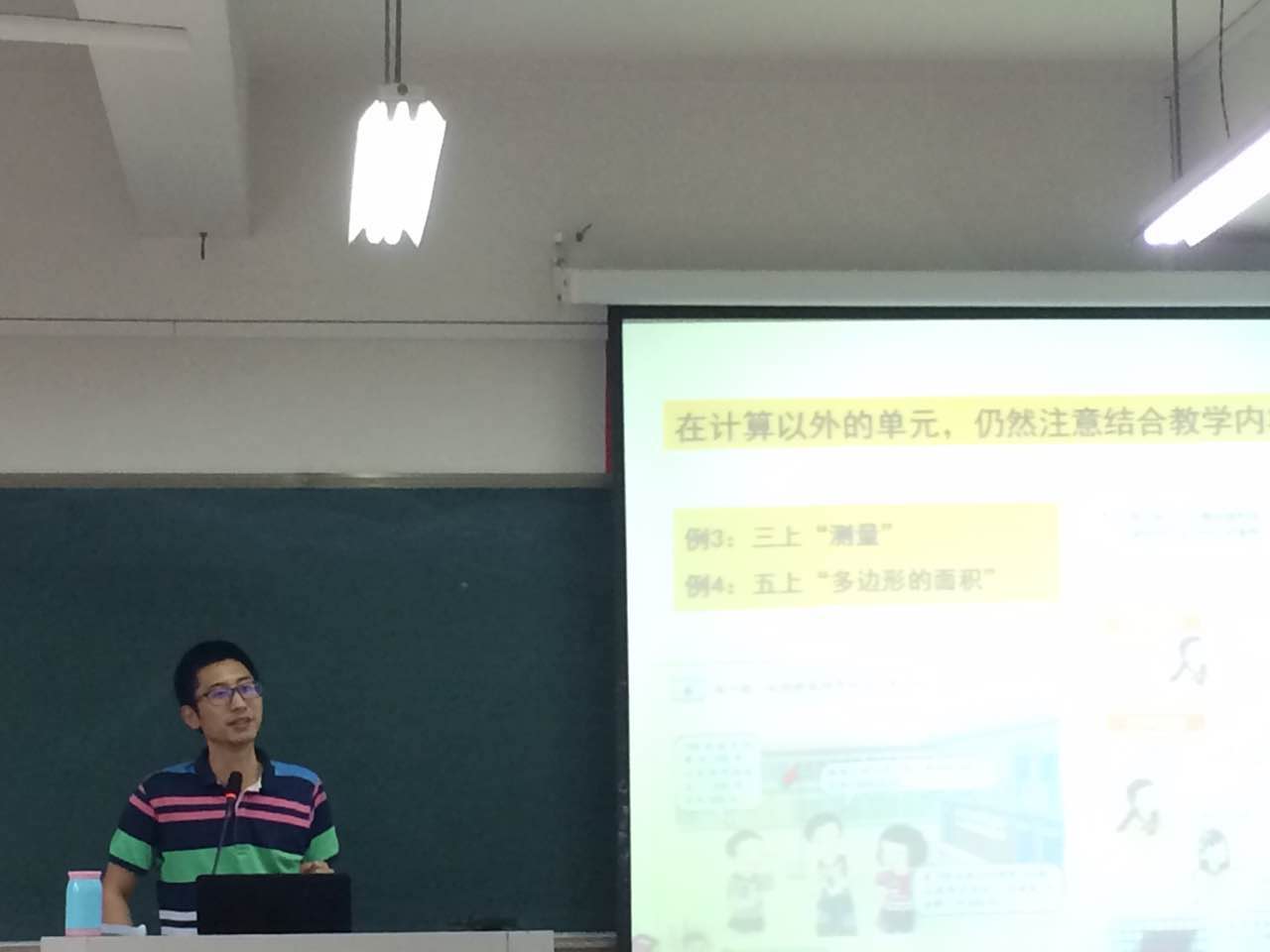 李炜老师在讲座中还提到了数学知识教育、能力教育以及核心素养。他强调书本呈现的内容是静态的结果。作为未来的老师,我们在进行课本研读前,要学会将这静态的结果转变为学生参与的过程。他结合教材,以《角度的测量》和《厘米的认识》这两个实例,告诉我们该怎样读懂主题图和图例,怎样在整体上把握教材,研读教材。他还谈到作为一名数学老师要看清教材中蕴含的数学思想,而这种数学思想不是讲出来的,而是悟出来的。最后,李老师在讲座中分享了自己的亲身教学经历,同时也强调了研读教学的意义和注意点。