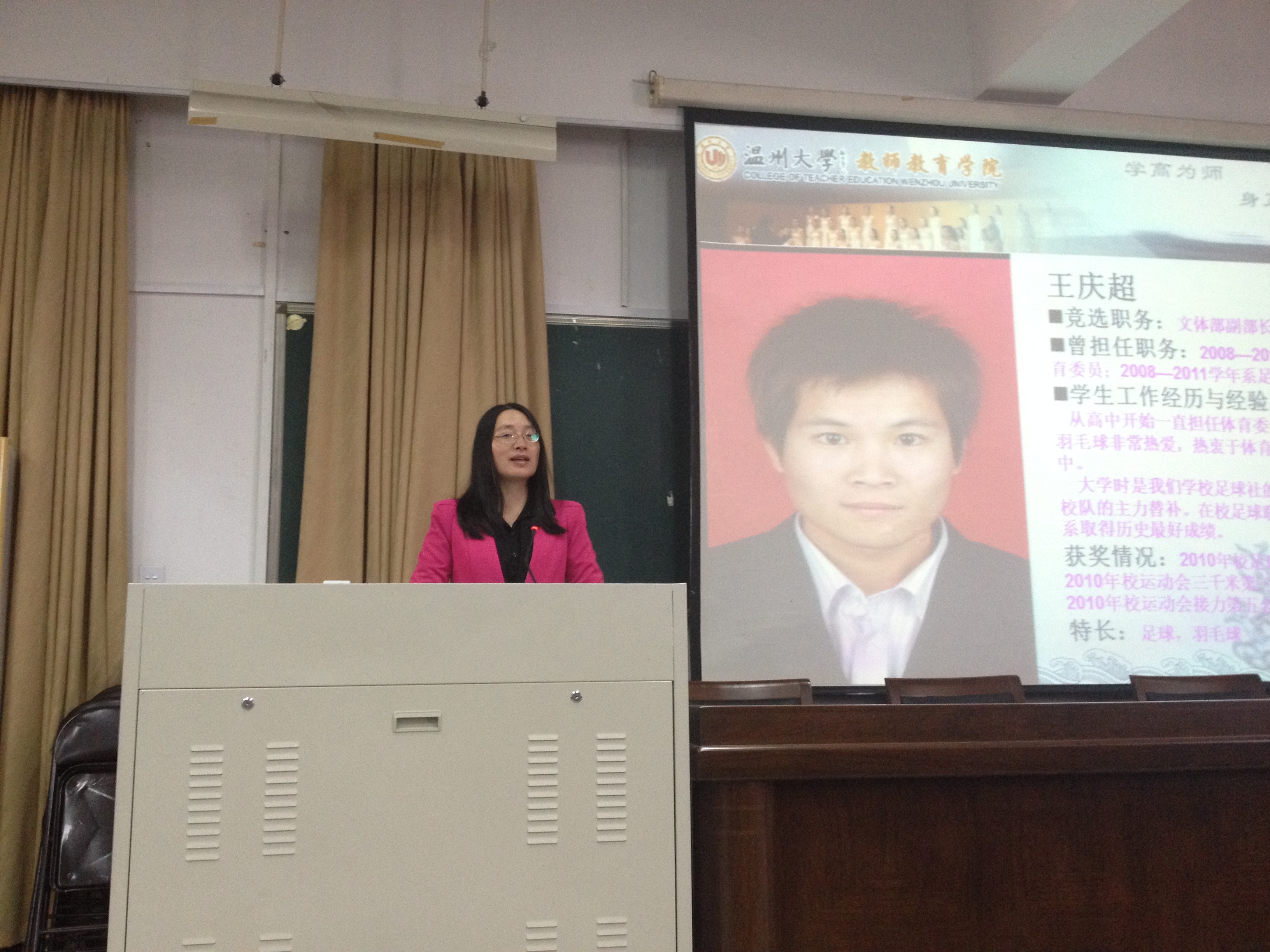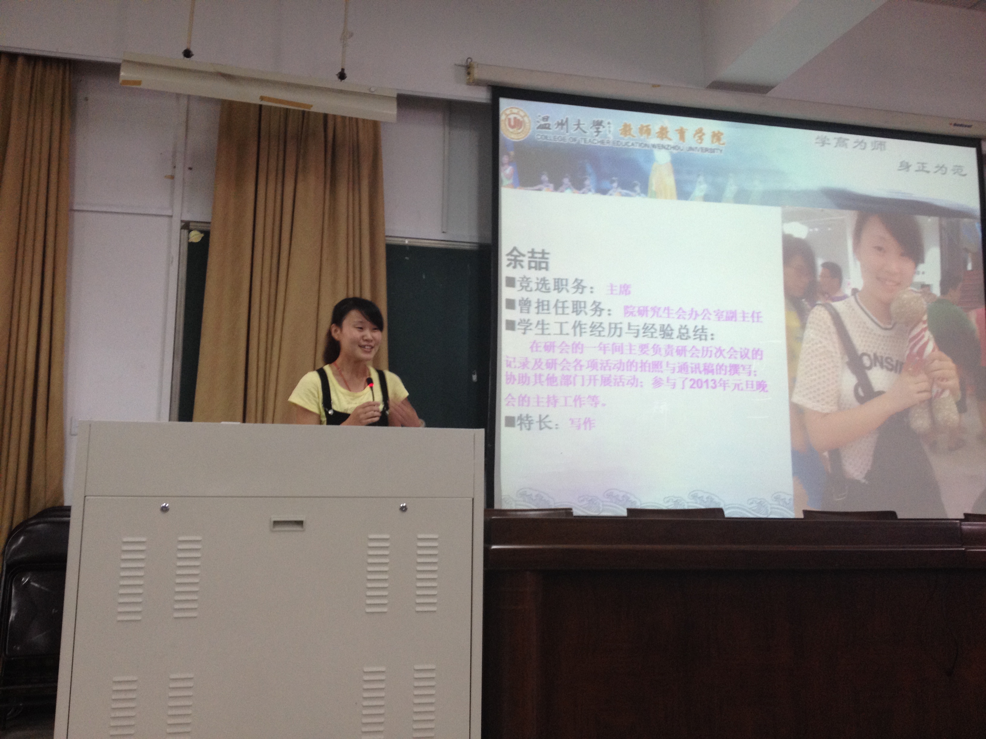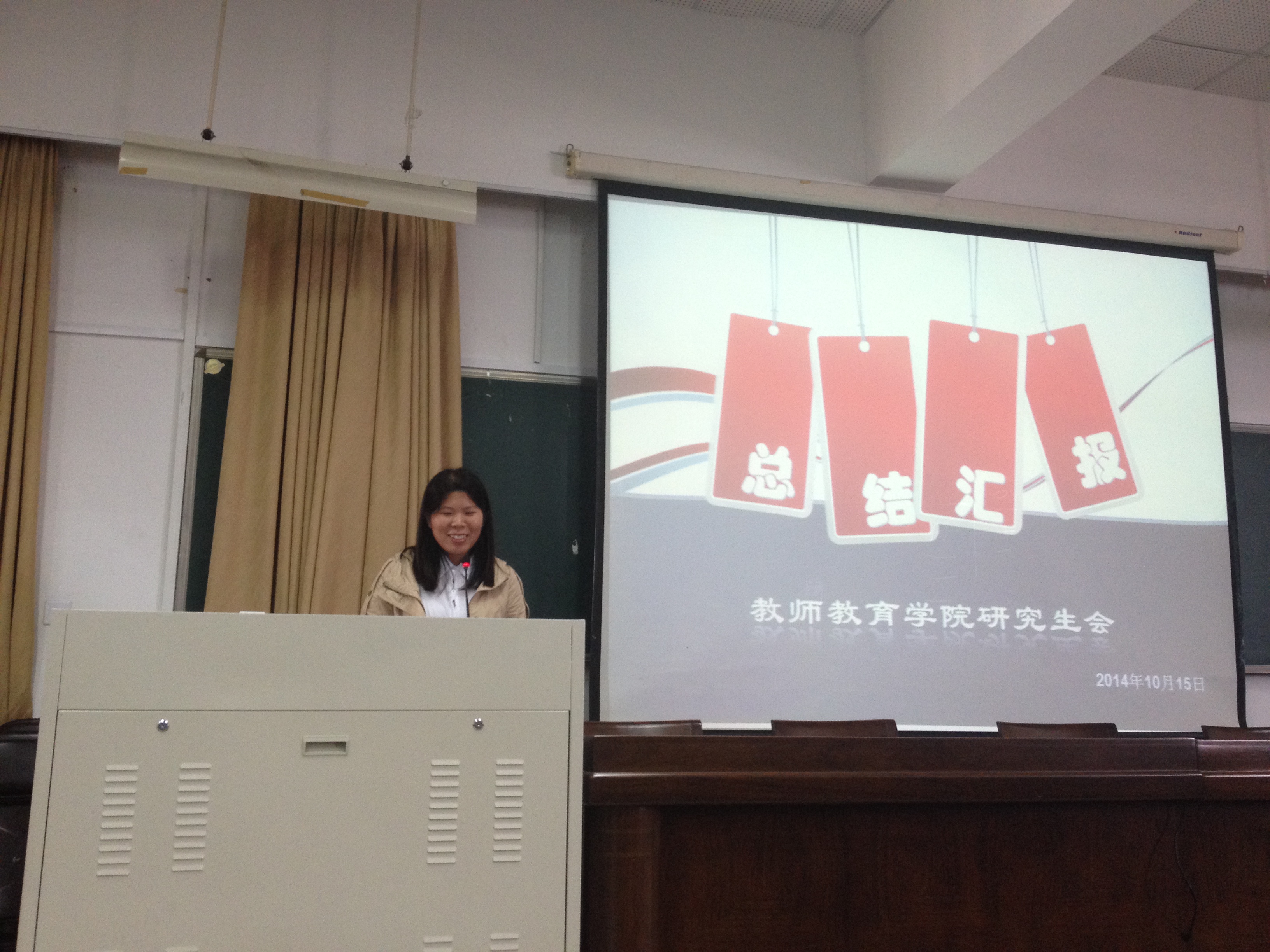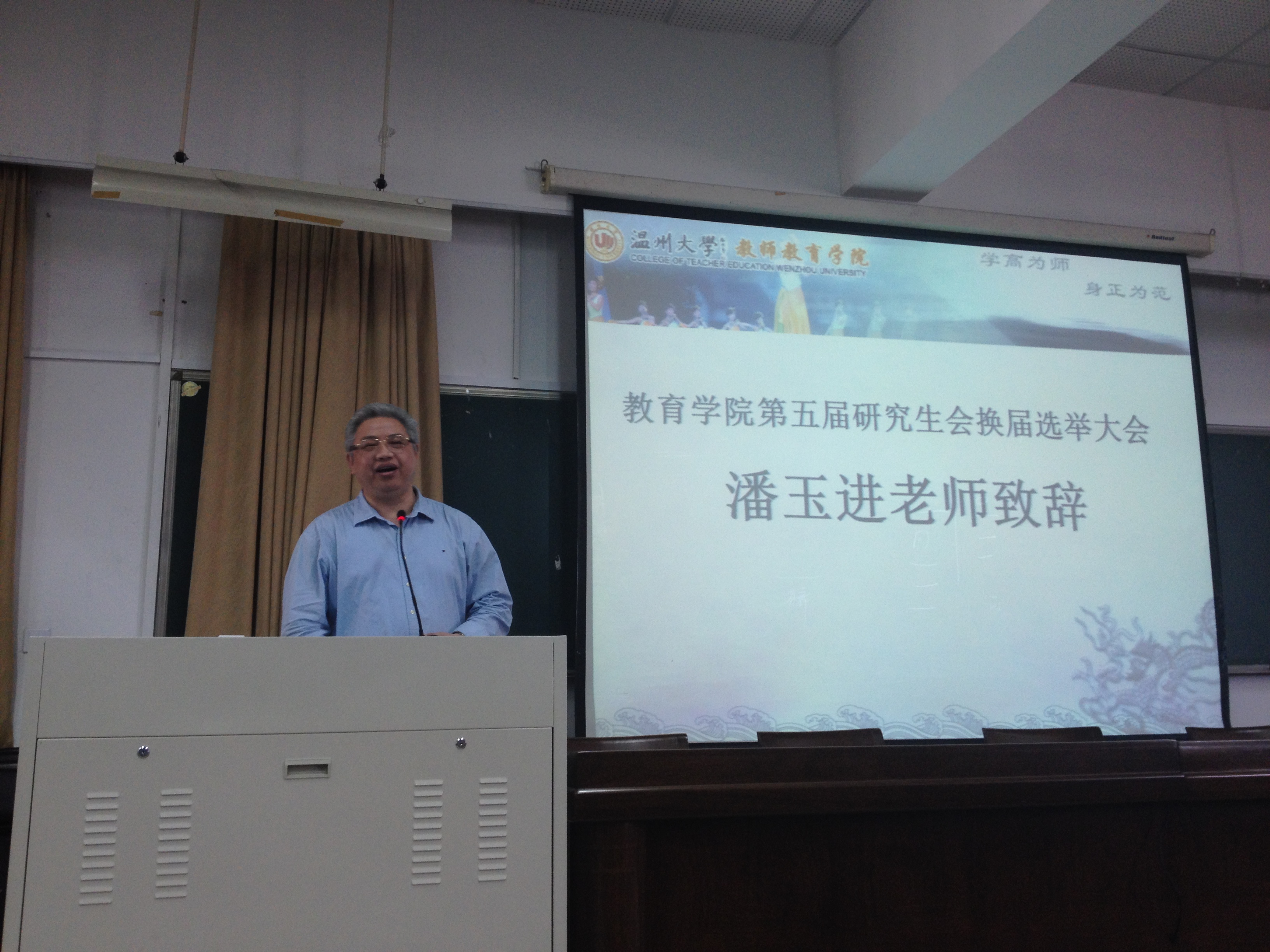 第五届研究生会换届选举大会在北校区3#101室如期举行。副院长潘玉进老师、教育学系党支部书记周奇老师和辅导员吴冬冬老师以及13、14级所有研究生参加了大会,会议由研究生会主席江仔媛主持。