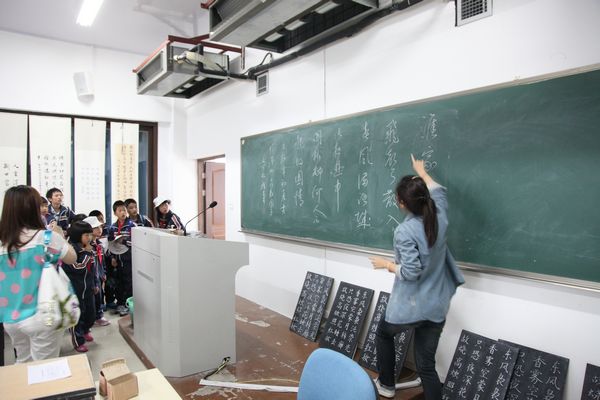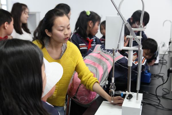 首先来到的是自然科学实验室。看到桌子上的一台台光学显微镜,孩子们的眼睛里马上充满了好奇与向往。我们的志愿者不仅向孩子们一一介绍了人工气候箱、数码显微镜、旋涡混合器、电动玻璃匀浆机等,还手把手教他们使用光学显微镜来观察草履虫装片,用体视显微镜观察蜜蜂、花朵等。同时,每个人都有机会,利用养在实验室里的泥蚶来亲手制作一片血涂片,并在显微镜下进行观察。在机器人实验室,志愿者为孩子们现场模拟了机器人的搬物行为;在天文实验室里,孩子们使用望远镜欣赏远处的风景;在心理实验室,孩子们使用反应测试仪器来测试自己的反应速度;在书法实验室,他们见到了财神捕鱼 学子们优秀的书法作品……