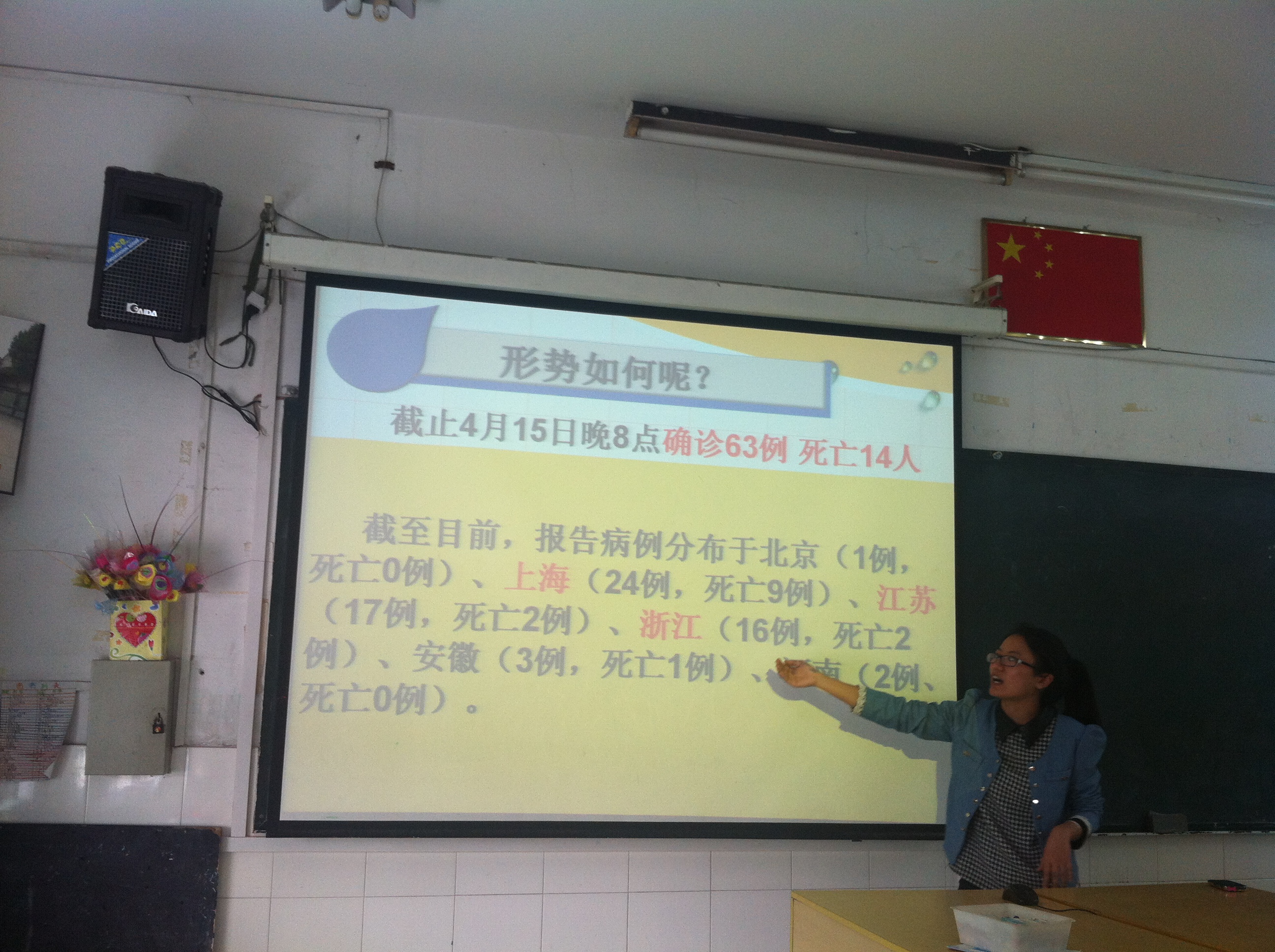 下午我们各自跟着自己的班级,在第一节课的时候都上了课,观琼他们组给三年级的学生上了一堂书法课,而我和陶婷就给五(4)班的学生上了一节班会课,内容是关于最近非常引起市民关注的禽流感问题,一节班会课下来,既有有趣味型的视频,又有很多贴近生活的日常知识,相信这样一节班会课后学生对于如今的H7N9会有更多的了解和深入。