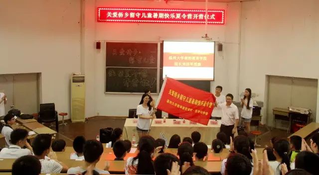 接过鲜红的旗帜,听到郑信军院长一声“2016年关爱侨乡留守儿童暑期快乐夏令营开营!”,实践队员将就此启程,开启爱心义教之旅。