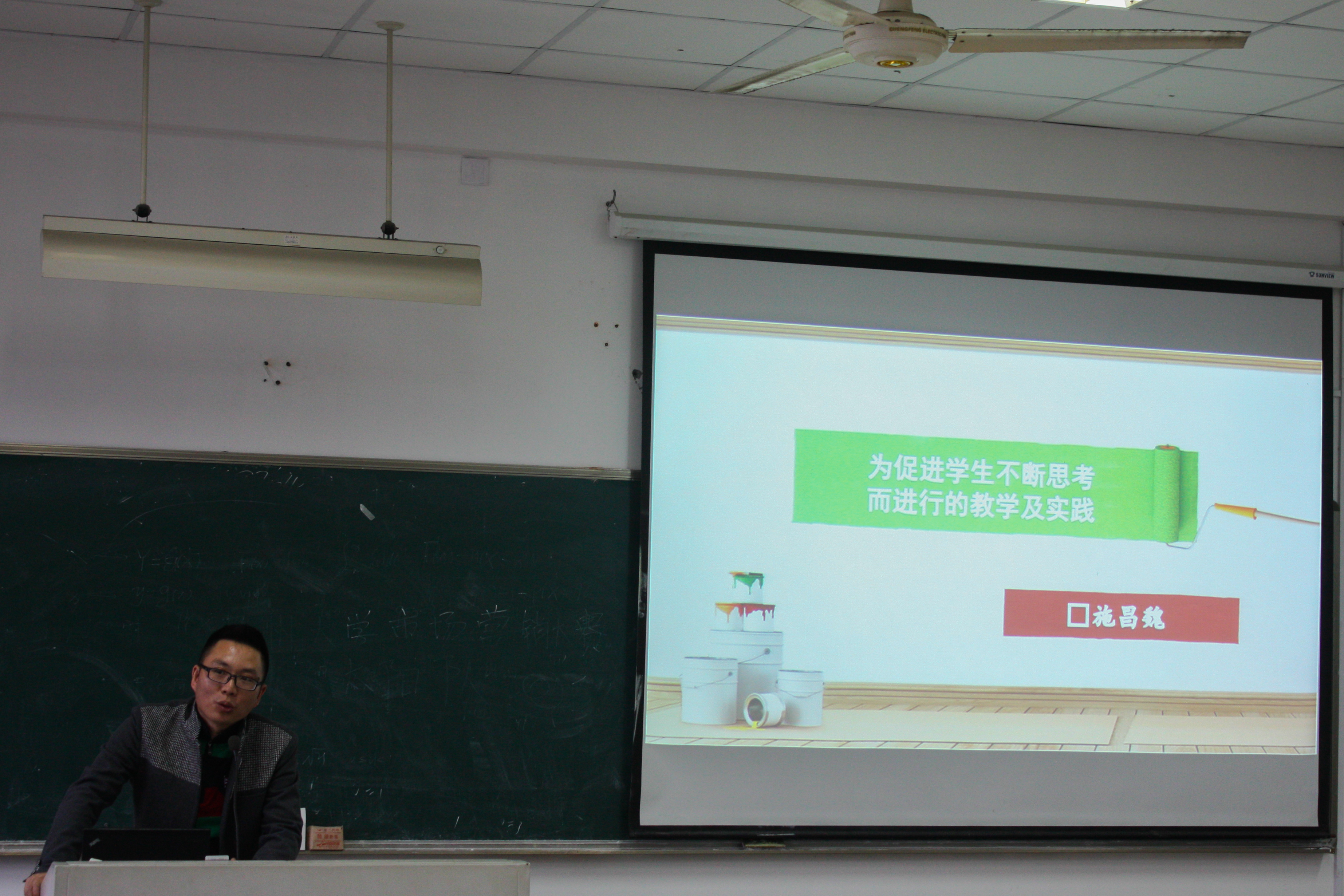 在2013年11月27日下午1:30—3:30于北3-401开展了名师大讲堂活动。本次讲座由施昌魏老师担任主讲人,主题为“为促进学生不断思考而进行的教学及实践”。本次活动由小教系主办,小教工作室承办,小教系教师谭莉老师主持,12级小教本全体学生参与本次讲座。