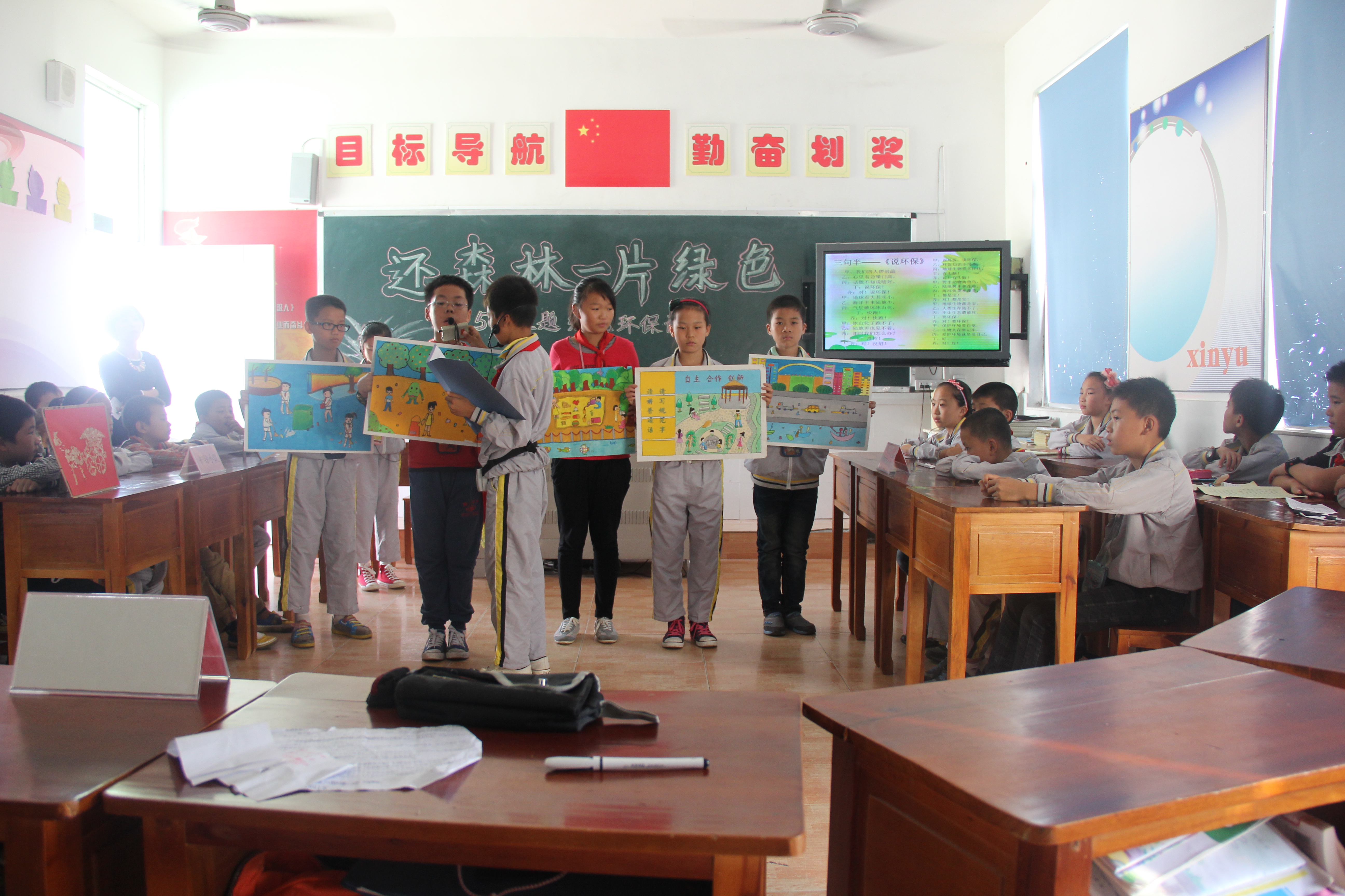 领导的陪同下,我们旁听了一节生动有趣且充满教育意义的环保主题班会,整节课主要由学生自己主持,课堂内容紧贴生活实际,形式多样,从诗歌朗诵到小品表演,从歌唱环保到废物回收再利用,无不体现出学生高度参与的热情和较强的动手操作能力,展示了学生较强的综合素质。听完了这节极具教育意义的环保课后,校方组织了一场讲座,讲座期间讨论热烈,气氛活跃,折延东教授作为此次讲座的主讲人,他就绿色教育的发展现状、如何继续深化财神捕鱼