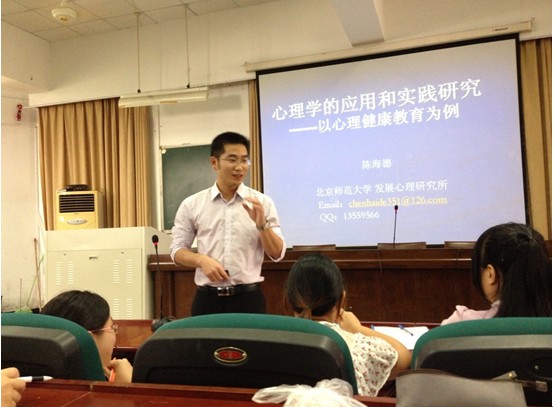08届毕业生陈海德学长给我们上了一堂有关心理学的应用和实践研究的课,课堂氛围融洽,师生互动活跃。
