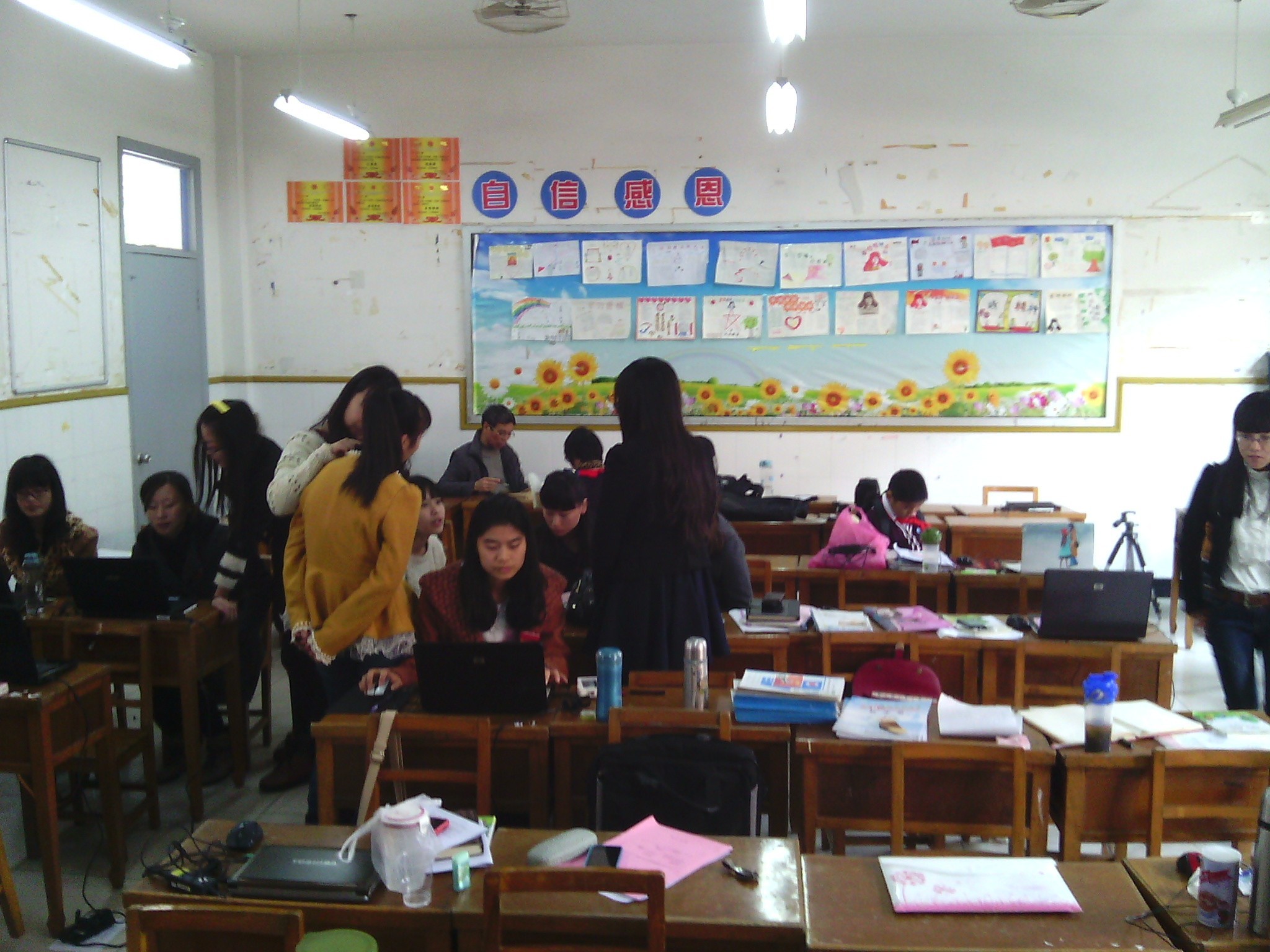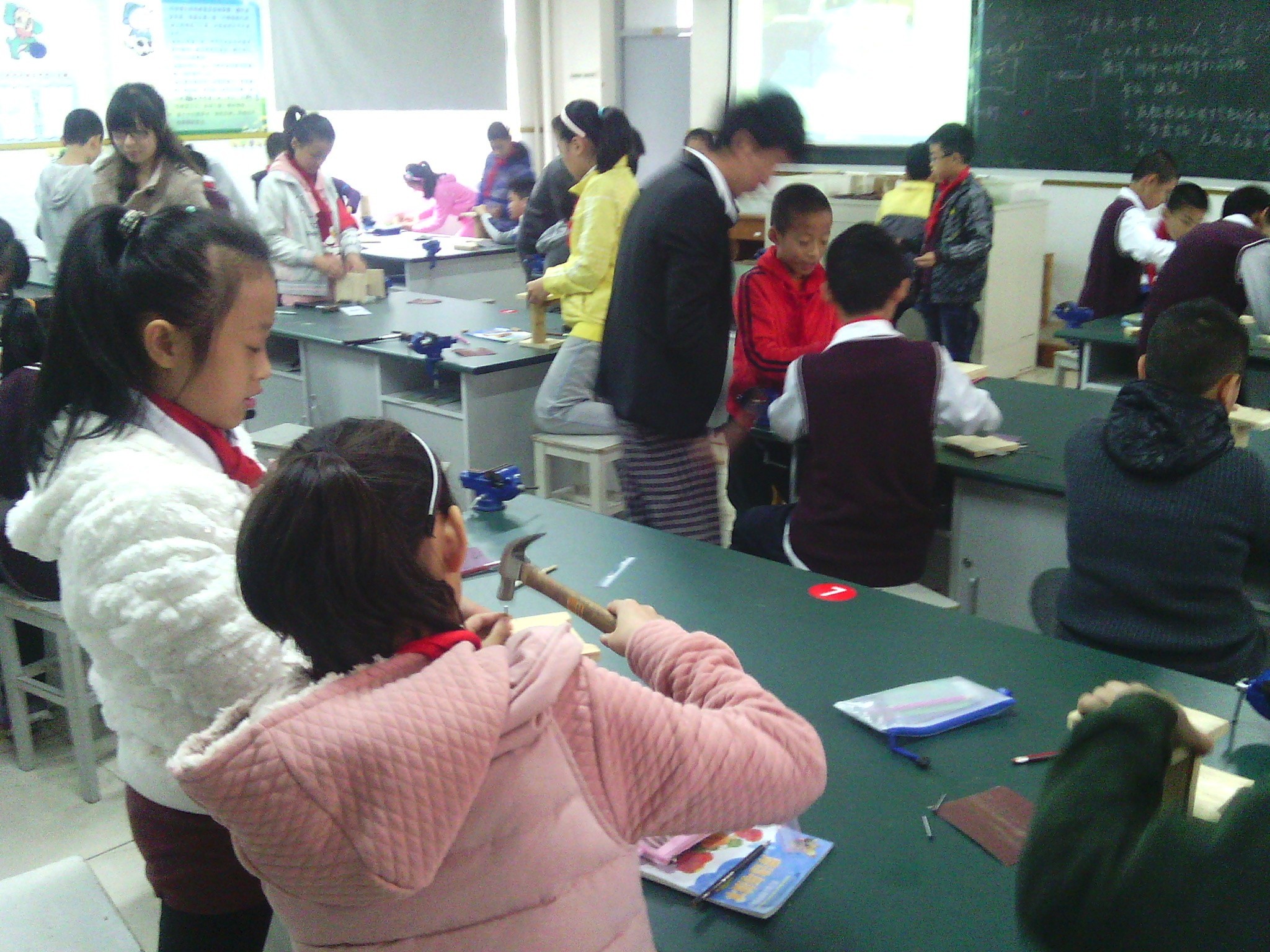 这是孩子们上课的情景。大概是手工制作课吧,同学们以小组为单位,一个个小小的身影围成一圈,充分发挥各自的想象力和动手能力,用心制作着心目中的“小发明”,不算大的实验桌成为他们展现自己的舞台。看,他们的眼神多么专注,毫不敷衍的态度连老师都被折服,只在一旁静静地看着,等待着伟大成果的诞生。