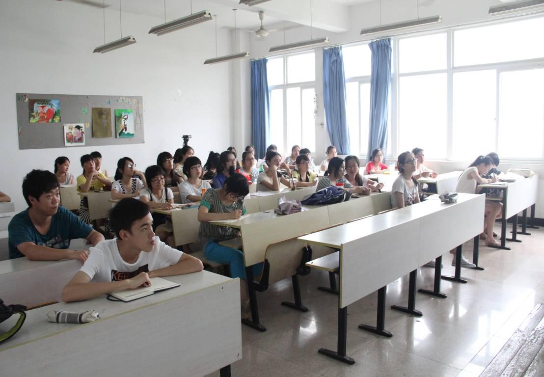 林老师开讲前以“羡慕”、“嫉妒”两个词表达了与同学们首次见面的心情并拉近了彼此的距离,接着以“恨”字表达了自己因为家庭不能付出过多精力在工作上的苦恼。然后林老师便进入了今天讲座的主题——课堂教学设计的细节考虑——以“词语输入速度快”这一课为例,从四个思考点:导入的设计、中心过程的设计、语言的设计、以及课前交流的设计这四个方面阐述了如何进行课堂的教学设计,并以自己的试讲和比赛经历作为例子,对比了自己前后三次试讲和最后比赛的教学设计方案,从小的切入点和自己课堂的典型环节为同学们分析了如何从细节处考虑课堂教学的设计。讲座过程中,老师还不时以幽默风趣的语言向同学们传达了作为一名小学教师,应该注重对学生的鼓励以及课堂纪律的管理的重要性,每位同学都听得十分认真,被老师的语言深深地感染了。