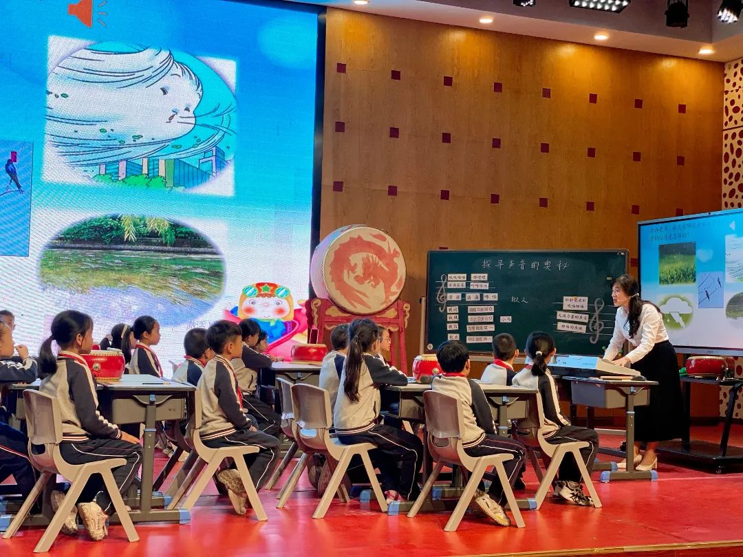 徐然、周秋爱、潘海鸥老师合作执教《探索声音的奥秘》一课以大声音博物馆的情境导入,带领学生走进三个富有特色的展厅。在“声音写真馆”展厅,徐然老师用轻缓而又富有活力的声音,为学生娓娓道来大自然的声音的神奇之处,带领学生走进了声音。在“声音实验站”展厅,孩子们对“橡皮筋是怎样发出声音的”这一问题提出了自己不同的猜想,再借助各种实验器材研究更多物体是怎样发出声音的。“秋雨唱歌呀,滴答,滴答,秋风弹琴呀,沙沙,沙沙……”在“声音魔坊”展厅,孩子们在潘海鸥老师的指导下用鼓、沙锤、双响筒、碰铃伴奏,合作完成了一场秋天的音乐会。