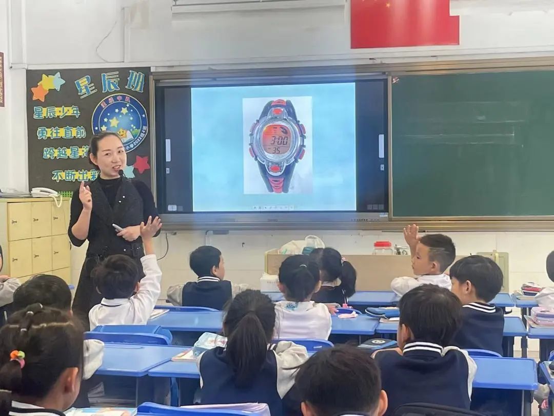 娄天婵老师为同学们带来一节一年级上册的数学课堂《认识钟表》。在课堂当中,娄老师注重口诀记忆法,她将自己摆成一个钟表的形状,并向学生传授口诀“12点点头,6来跺跺脚,右手抓抓3,左手摸摸9”,以具象而直观的方式辅助学生对于钟表的记忆。同时,娄老师灵活运用教具教学,通过学生自己手动拨指针的方式,让学生通过实践,真实感受到钟表指针运作的规律,在学习钟表的同时,调动学生学习积极性,提高课堂效果。