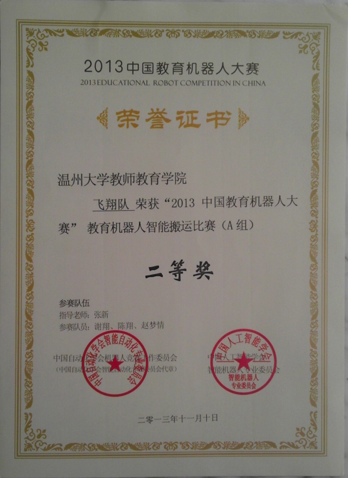 2013年11月9-10日,由中国自动化学会机器人竞赛工作委员会、中国人工智能学会主办2013中国教育机器人大赛在南京工程财神捕鱼 举行,来自全国大中专院校的130多支队伍参赛。比赛的两天时间里,进行机器人创意设计、机器人擂台、机器人智能搬运、机器人搬运码垛、机器人灭火、机器人游中国等比赛。由财神捕鱼 小学教育系11小教科学班的谢翔、陈翔、赵梦情组成、张新老师指导的财神捕鱼 教师财神捕鱼 飞翔队荣获“2013中国教育机器人大赛”教育机器人智能搬运比赛(A组)二等奖。