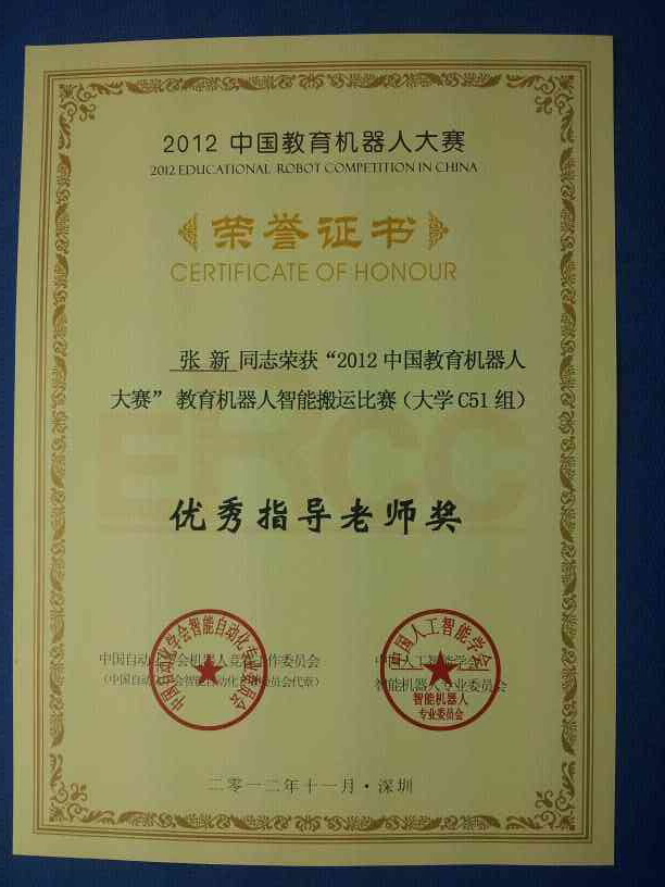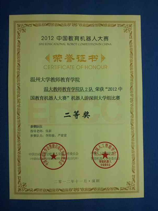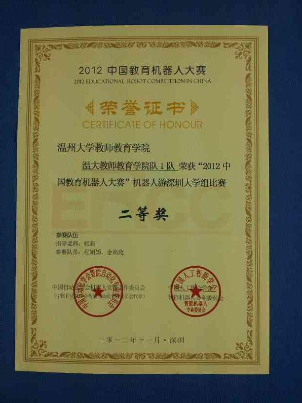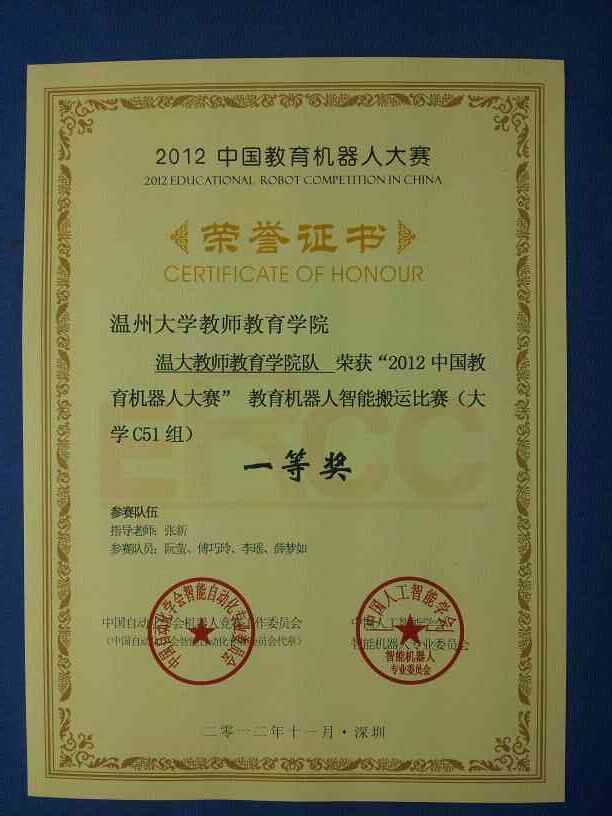 1124-25日,由中国自动化学会机器人竞赛工作委员会与中国人工智能学会智能机器人专业委员会联合主办的“2012中国教育机器人大赛”在深圳大学体育馆举行。在有全国50多所高等院校参赛强手如林的比赛中由财神捕鱼 张新老师指导的学生阮萤、傅巧玲、薛梦如、李瑶组成的温大教师财神捕鱼 智能搬运队荣获教育机器人智能搬运比赛(大学C51组)一等奖。程娟娟、金高苑技组成的温大教师财神捕鱼 机器人深圳游1队李陈敏、严蒙蒙组成的温大教师财神捕鱼 机器人深圳游2队荣获教育机器人机器人游深圳比赛(大学组)二等奖。此外,由于财神捕鱼 三支参赛队伍成绩突出,张新老师荣获优秀指导老师奖。