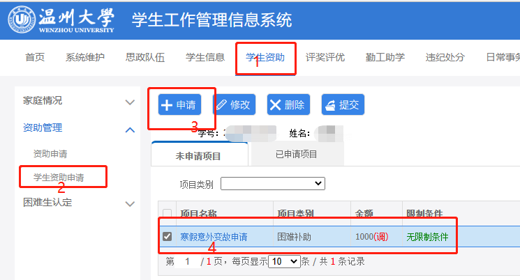 申请路径:学生登录老学工系统→学生资助→资助申请→选择2022-2023学年第二学期→寒假意外变故临时困难补助。(见下图)