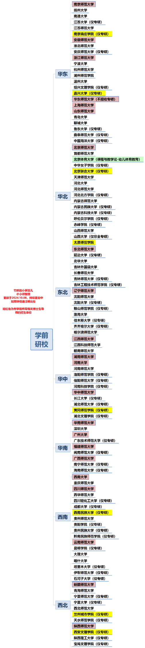 1. 明确项目的专业、院校与潜在导师:善用网络资源,了解并分析多种就业选择、项目区别(例如:境内院校的学术型、专业型硕士,境外院校的授课型、研究型硕士)、往年招生情况(例如:境内院校的硕士项目多为考核制,了解其近三年报录比;境外院校多为申请制,了解其在读生学业背景)等。境内学前教育硕士点可参考下图,境外参见网络资源。